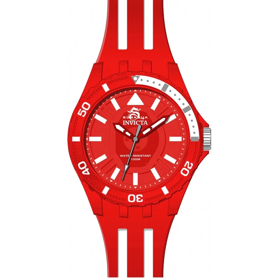 Red acrylic case with a red silicone strap. Fixed red acrylic bezel. Red dial with red hands and index hour markers. Minute markers around the outer rim. Dial Type: Analog. Luminescent hands and markers. Hattori Caliber PC21S quartz movement. Scratch resistant Flame Fusion crystal. Pull / push crown. Solid case back. Round case shape, case size: 44 mm. Band width: 26 mm, band length: 7.75 inches. Buckle clasp. Functions: hour, minute, second. Subaqua Series. Casual watch style. Watch label: Japan Movt. Invicta Subaqua Quartz Red Dial Men's Watch 69450. GENERAL Box Type: Original Box CASE Case Material: Acrylic Case Shape: Round Case Back: Solid BAND Band Material: Silicone Band Type: Strap Band Color: Red Band Length: 7.75 inches Band Width: 26 mm Clasp: Buckle DIAL Dial Color: Red Type: Analog Crystal: Flame Fusion Hands: Red Dial Markers: Index Second Markers: Minute Markers around the outer rim Luminiscence: Hands and Markers Bezel: Fixed Bezel Color: Red Bezel Material: Acrylic Crown: Pull / Push INFORMATION Brand: Invicta Series: Subaqua Collection Name: Subaqua Gender: Mens Model: 69450 Watch Label: Japan Movt Movement: Quartz Engine: Hattori Caliber PC21S FEATURES Functions: Hour, Minute, Second Watch Features: Analog ADDITIONAL INFO Watch Style: Casual Warranty: With Manufacturer's Guarantee UPC Code: 886678678631 Jomashop Sku: IN69450 Department: Watches