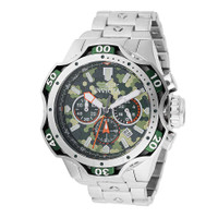 Silver-tone and silver and green aluminum and stainless steel case with a silver-tone stainless steel bracelet. Uni-directional rotating three-tone (silver-tone and silver and green) aluminum and stainless steel bezel. Light green and olive green and green and gold dial with silver-tone hands and index hour markers. Compass markers around the outer rim. Dial Type: Analog. Luminescent hands and markers. Date display between 4 and 5 o'clock position. Chronograph - three sub-dials displaying: 60 second, 60 minute and 24 hour. Hattori Caliber VD53 quartz movement. Scratch resistant mineral crystal. Pull / push crown. Solid case back. Round case shape, case size: 52.5 mm, case thickness: 23.2 mm. Band width: 30.8 mm, band length: 8.25 inches. Fold over safety clasp. Water resistant at 100 meters / 330 feet. Functions: chronograph, date, GMT, second time zone, hour, minute, second. Venom Series. Sport watch style. Watch label: Japan Movt. Invicta Venom Chronograph GMT Date Quartz Men's Watch 47755. CASE Case Size: 52 Case Thickness: 23.2 mm Case Material: Aluminum and Stainless Steel Case Shape: Round Case Back: Solid BAND Band Material: Stainless Steel Band Type: Bracelet Band Color: Silver-tone Band Length: 8.25 inches Band Width: 30.8 mm Clasp: Fold over safety DIAL Dial Color: Light Green and Olive Green and Green and Gold Type: Analog Crystal: Scratch Resistant Mineral Hands: Silver-tone Dial Markers: Index Second Markers: Compass Markers around the outer rim Sub Dials: Three - 60 second, 60 minute and 24 hour Luminiscence: Hands and Markers Bezel: Uni-directional Rotating Bezel Color: Three-tone (Silver-tone and Silver and Green) Bezel Material: Aluminum and Stainless Steel Crown: Pull / Push INFORMATION Brand: Invicta Series: Venom Collection Name: Venom Gender: Mens Model: 47755 Watch Label: Japan Movt Movement: Quartz Engine: Hattori Caliber VD53 FEATURES Water Resistance: 100 meters / 330 feet Calendar: Date display between 4 and 5 o'clock position Functions: Chronograph, Date, GMT, Second Time Zone, Hour, Minute, Second Watch Features: Analog, GMT, Gold, Stainless Steel, Compass, Chronograph, Time Zone ADDITIONAL INFO Watch Style: Sport Warranty: With Manufacturer's Guarantee UPC Code: 886678636440 Jomashop Sku: IN47755 Department: Watches