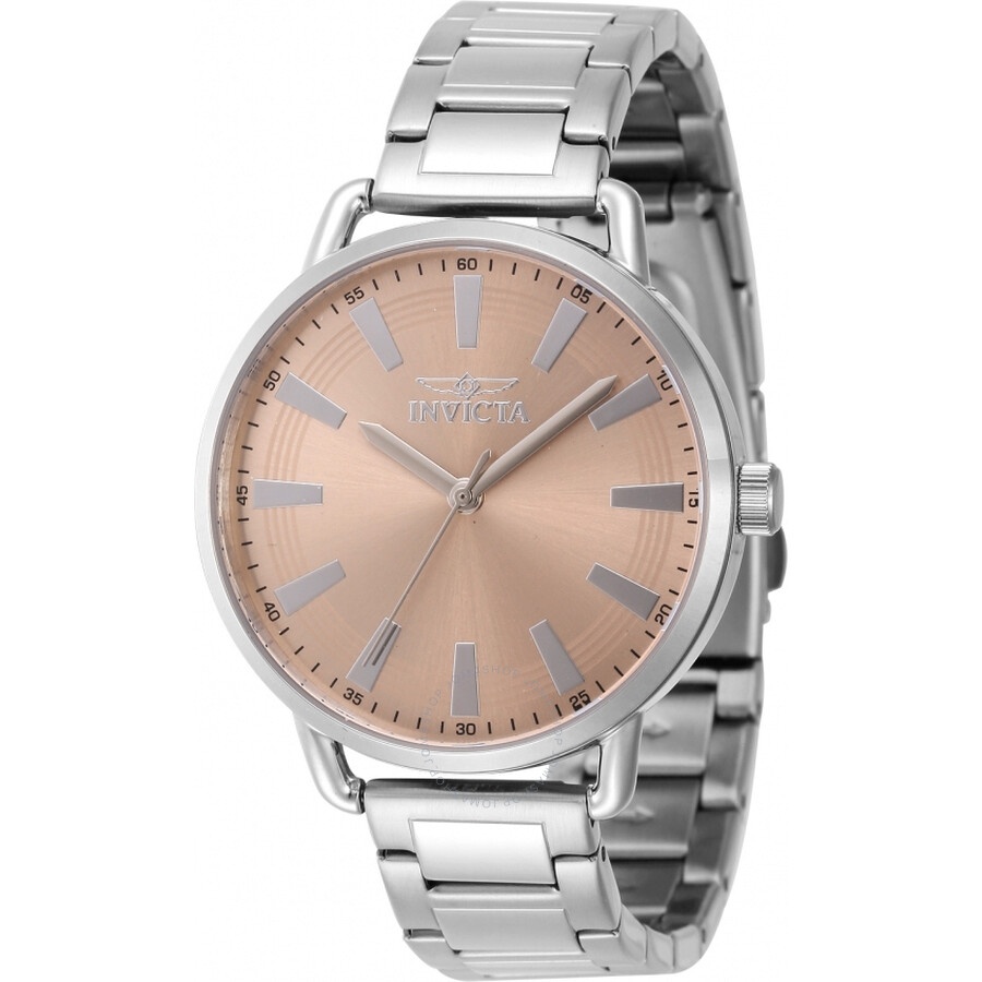 Silver-tone stainless steel case and bracelet. Fixed silver-tone stainless steel bezel. Light pink dial with silver-tone hands and index hour markers. Minute markers around the outer rim. Dial Type: Analog. Hattori Caliber PC21 quartz movement. Scratch resistant Flame Fusion crystal. Pull / push crown. Solid case back. Round case shape, case size: 38 mm, case thickness: 8.3 mm. Band width: 16 mm, band length: 6.50 inches. Fold over push button clasp. Water resistant at 50 meters / 165 feet. Functions: hour, minute, second. Wildflower Series. Casual watch style. Watch label: Japan Movt. Invicta Wildflower Quartz Light Pink Dial Ladies Watch 46329. CASE Case Size: 38 Case Thickness: 8.3 mm Case Material: Stainless Steel Case Shape: Round Case Back: Solid BAND Band Material: Stainless Steel Band Type: Bracelet Band Color: Silver-tone Band Length: 6.50 inches Band Width: 16 mm Clasp: Fold over push button DIAL Dial Color: Light Pink Type: Analog Crystal: Flame Fusion Hands: Silver-tone Dial Markers: Index Second Markers: Minute Markers around the outer rim Bezel: Fixed Bezel Color: Silver-tone Bezel Material: Stainless Steel Crown: Pull / Push INFORMATION Brand: Invicta Series: Wildflower Collection Name: Wildflower Gender: Womens Model: 46329 Watch Label: Japan Movt Movement: Quartz Engine: Hattori Caliber PC21 FEATURES Water Resistance: 50 meters / 165 feet Functions: Hour, Minute, Second Watch Features: Stainless Steel, Analog ADDITIONAL INFO Watch Style: Casual Warranty: With Manufacturer's Guarantee UPC Code: 886678615407 Jomashop Sku: IN46329 Department: Watches
