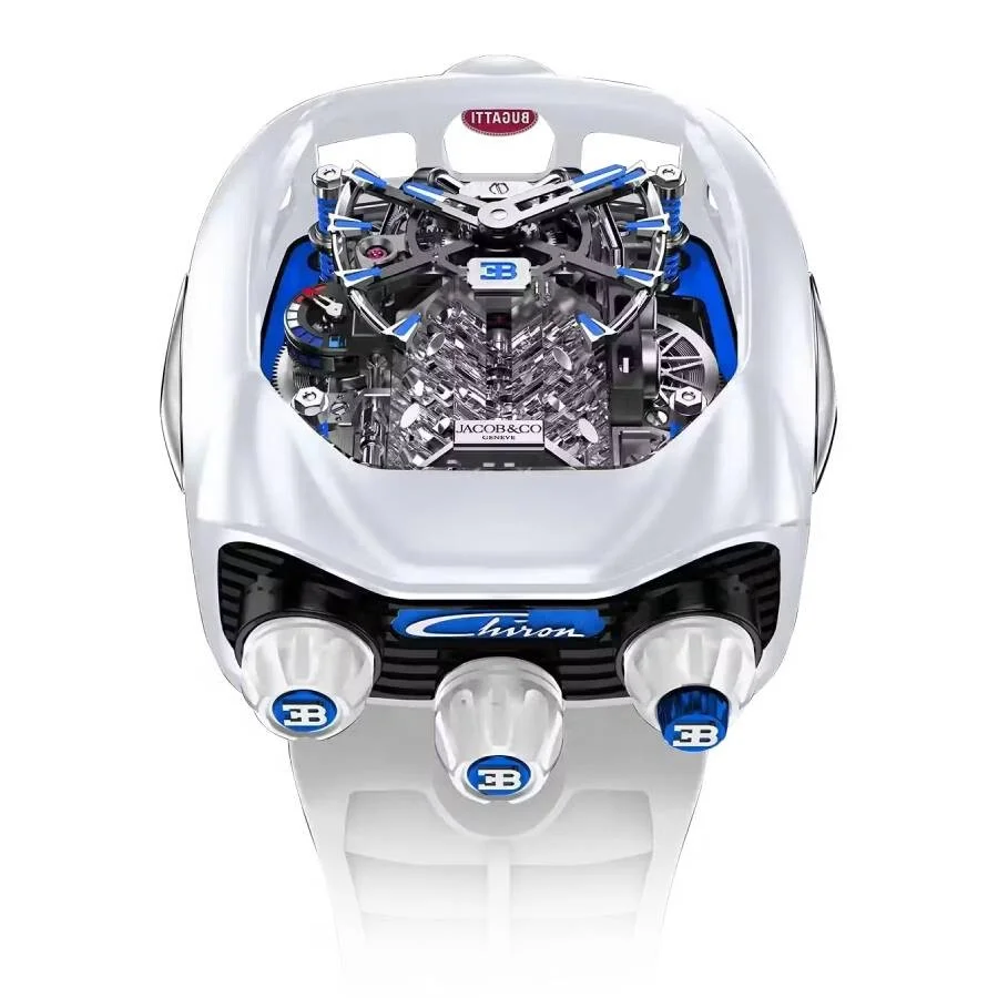 : Titanium white ceramic coating case with a white rubber strap. Fixed white titanium white ceramic coating bezel. Rhodium-plated dial with blue indices and blue "eb" logo dial with rhodium-plated skeleton hands with blue and luminescent tips hands and index hour markers. Dial Type: Analog. Luminescent hands. Power reserve indicator at 9 o'clock. One-minute flying tourbillon with 30° incline subdials. Jacob & Co. Calibre JCAM37 hand wind movement with a 60-hour power reserve. Scratch resistant sapphire crystal. Transparent see through case back. Unique case shape, case size: 57.8 x 43.8 mm, case thickness: 21.6 mm. Deployment with push button release clasp. Water resistant at 30 meters / 100 feet. Functions: hour, minute, tourbillon, w16 engine-block automaton. Additional Info: limited 9 pieces. Bugatti Chiron Tourbillon Series. Luxury watch style. Watch label: Swiss Made. Jacob Co. Bugatti Chiron Tourbillon Hand Wind Men's Watch BU240.95.AB.AB.A. GENERAL Box Type: Original Box CASE Case Diameter: 57.8 x 43.8 mm Case Thickness: 21.6 mm Case Material: Titanium White Ceramic Coating Case Shape: Unique Case Back: Transparent See Through BAND Band Material: Rubber Band Type: Strap Band Color: White Clasp: Deployment with Push Button Release DIAL Dial Color: Rhodium-plated Dial with Blue Indices and Blue "EB Type: Analog Crystal: Scratch Resistant Sapphire Hands: Rhodium-plated Skeleton Hands with Blue and Luminescent Tips Dial Markers: Index Sub Dials: One-minute Flying Tourbillon with 30° Incline Luminiscence: Hands Bezel: Fixed Bezel Color: White Bezel Material: Titanium White Ceramic Coating INFORMATION Brand: Jacob & Co. Series: Bugatti Chiron Tourbillon Collection Name: Bugatti Chiron Tourbillon Gender: Mens Model: BU240.95.AB.AB.A Watch Label: Swiss Made Movement: Hand Wind Engine: Jacob & Co. Calibre JCAM37 Power Reserve: 60 hours FEATURES Water Resistance: 30 meters / 100 feet Calendar: Power Reserve Indicator at 9 o'clock Functions: Hour, Minute, Tourbillon, W16 Engine-block Automaton Watch Features: Analog, Power Reserve Indicator, Ceramic, Rubber, Titanium, Tourbillon ADDITIONAL INFO Watch Style: Luxury Additional Info: Limited 9 pieces Jomashop Sku: JACBU24095ABABA Department: Watches