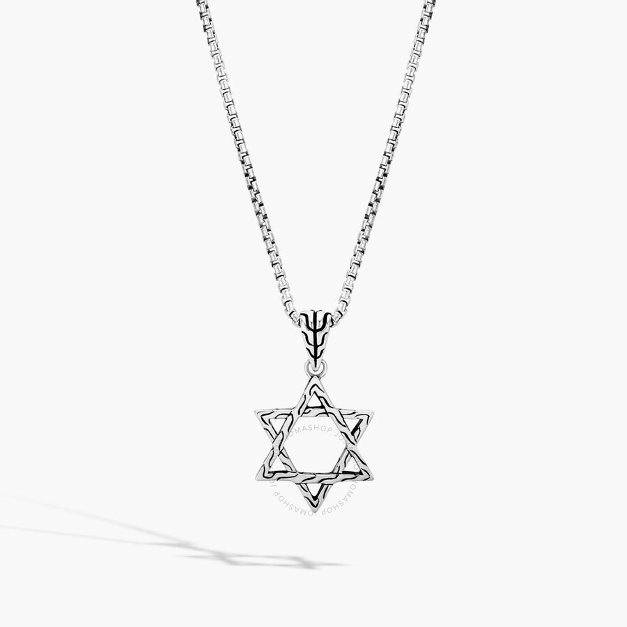 Religious jewelry designed by John Hardy, like this pendant necklace from the Classic Chain collection, makes it easy for you to show your faith fashionably. The sterling silver Star of David features classic chain motif details on the symbol and the bail it hangs from. The precious metal chain that’s 1.6mm wide and 20" long secures with a lobster clasp. This John Hardy necklace showcases a respectful reverence. - Sterling Silver - Chain measures 1.6mm wide - Pendant measures 27mm x 16mm - Size 20 inches - Lobster Clasp - NM999733X20. W: 9.1g. GENERAL Color: Silver-tone INFORMATION Brand: John Hardy Gender: Mens Model: NM999733X20 DETAILS Size Info: 20 inches Necklaces: 1 Band Material : Sterling Silver Metal Stamp: 925-Sterling ADDITIONAL INFO Jomashop Sku: Y-A47TH Department: Jewelry Category: Necklaces