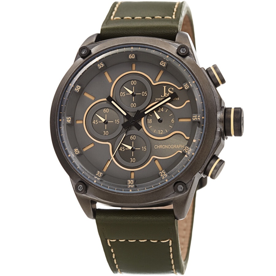 Composite metal case with a green leather strap. Fixed composite metal bezel. Grey dial with luminous black hands and index hour markers. Minute markers around the outer rim. Dial Type: Analog. Luminescent hands and markers. Chronograph - four sub-dials displaying: 60 second, 60 minute 1/10th of a second and 12 hour. Quartz movement. Scratch resistant mineral crystal. Pull / push crown. Solid case back. Round case shape. Case size: 48 mm. Case thickness: 14 mm. Band width: 22 mm. Band length: 8 inches. Tang clasp. Water resistant at 30 meters / 100 feet. Functions: chronograph, hour, minute, second. Fashion watch style. Joshua and Sons Chronograph Quartz Grey Dial Men's Watch JX133GN. INFORMATION Brand: Joshua And Sons Gender: Mens Model: JX133GN Movement: Quartz CASE Case Size: 48 mm Case Thickness: 14 mm Case Material: Composite Metal Case Shape: Round Case Back: Solid BAND Band Material: Leather Band Type: Strap Band Color: Green Band Length: 8 inches Band Width: 22 mm Clasp: Tang DIAL Dial Color: Grey Type: Analog Crystal: Scratch Resistant Mineral Hands: Luminous Black Dial Markers: Index Second Markers: Minute Markers around the outer rim Sub Dials: Four - 60 Second, 60 Minute 1/10th of a Second and 12 Hour Luminiscence: Hands and Markers Bezel: Fixed Bezel Material: Composite Metal Crown: Pull / Push FEATURES Water Resistance: 30 meters / 100 feet Functions: Chronograph, Hour, Minute, Second Watch Features: Chronograph, Leather, Analog ADDITIONAL INFO Watch Style: Fashion Warranty: With Manufacturers Guarantee Jomashop Sku: JOJX133GN Department: Watches Category: Watches