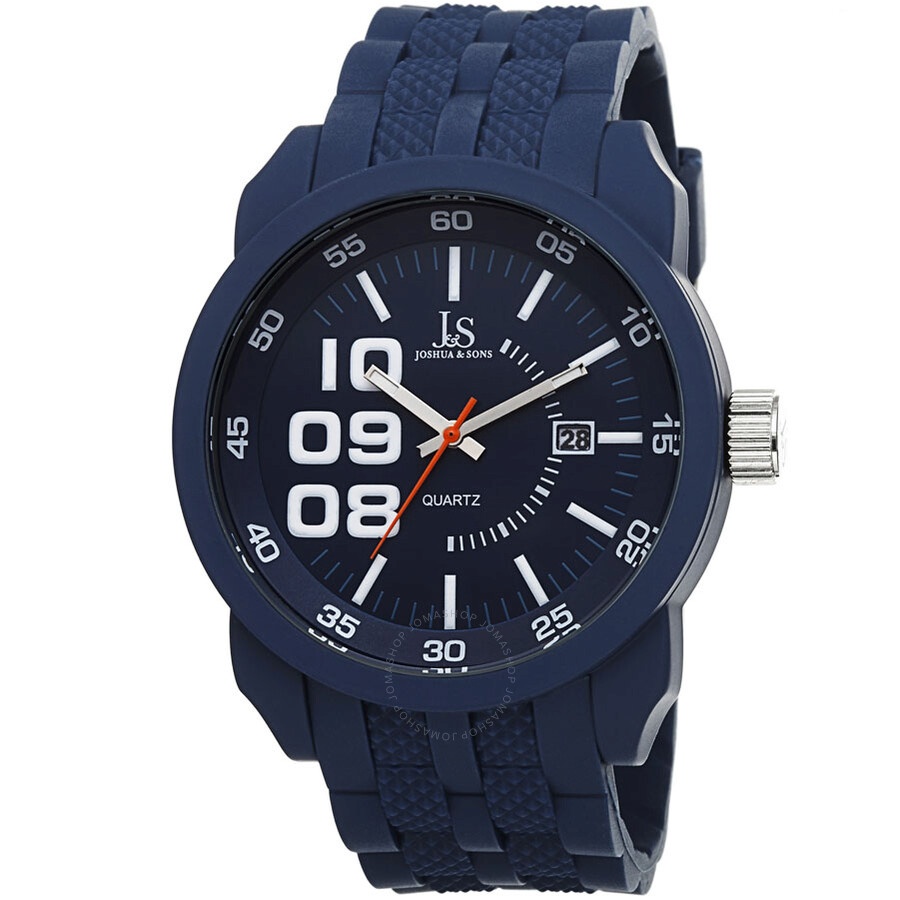 Blue ion-plated base metal case with a blue silicone strap. Fixed blue ion-plated base metal bezel. Blue dial with luminous silver-tone hands and index hour markers. Arabic numerals mark the 8, 9 and 9 o'clock positions. Minute markers. Arabic numeral minute markers (at 5 minute intervals) around the outer rim. Dial Type: Analog. Luminescent hands. Date display at the 3 o'clock position. Quartz movement. Scratch resistant mineral crystal. Pull / push crown. Screw down case back. Round case shape. Case size: 46 mm. Case thickness: 13 mm. Band width: 24 mm. Band length: 9 inches. Tang clasp. Water resistant at 10 meters / 33 feet. Functions: date, hour, minute, second. Sport watch style. Watch label: Hong Kong. Joshua and Sons Classsic Quartz Blue Dial Men's Watch JS63BU. INFORMATION Brand: Joshua And Sons Gender: Mens Model: JS63BU Watch Label: Hong Kong Movement: Quartz CASE Case Size: 46 mm Case Thickness: 13 mm Case Material: Base Metal Case Shape: Round Case Back: Screw Down BAND Band Material: Silicone Band Type: Strap Band Color: Blue Band Length: 9 inches Band Width: 24 mm Clasp: Tang DIAL Dial Color: Blue Type: Analog Crystal: Scratch Resistant Mineral Hands: Luminous Silver-tone Dial Markers: Index Second Markers: Arabic Numerals mark the 8, 9 and 9 o'clock positions. Minute Markers. Arabic Numeral Minute Markers (at 5 minute intervals) around the outer rim Luminiscence: Hands Bezel: Fixed Bezel Color: Blue Ion-plated Bezel Material: Base Metal Crown: Pull / Push FEATURES Water Resistance: 10 meters / 33 feet Calendar: Date display at the 3 o'clock position Functions: Date, Hour, Minute, Second Watch Features: Analog ADDITIONAL INFO Watch Style: Sport Warranty: With Manufacturers Guarantee UPC Code: 848572024082 Jomashop Sku: JO-JS63BU Department: Watches Category: Watches