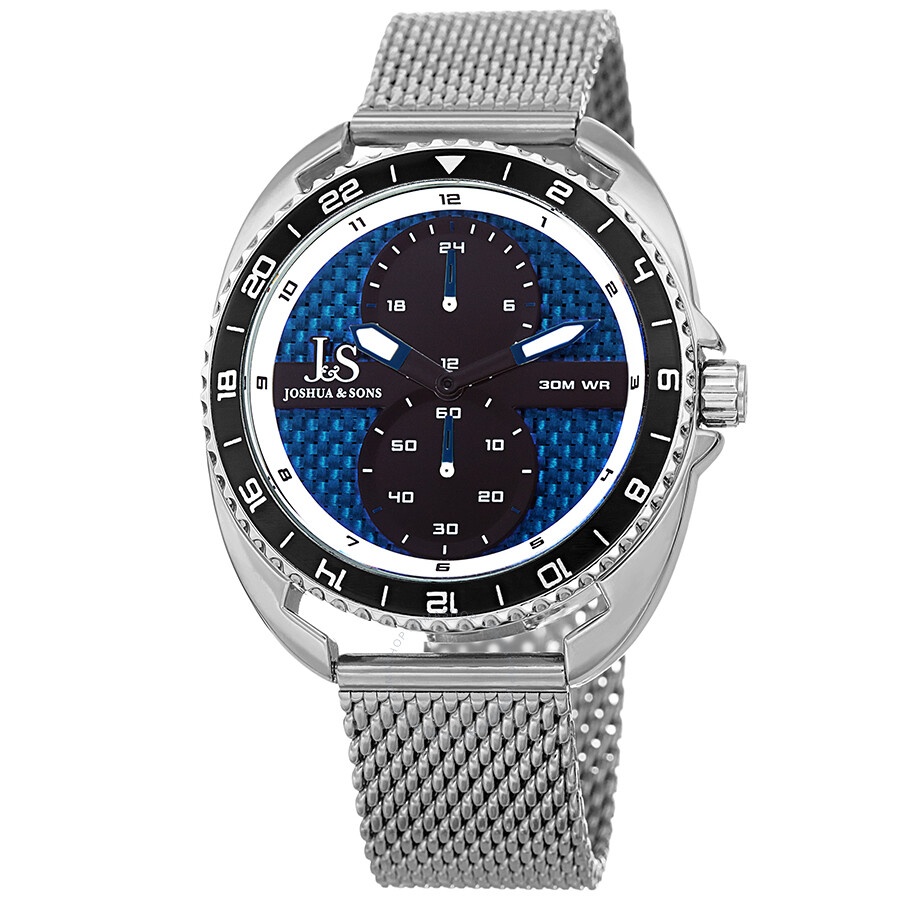 Silver-tone polished alloy case with a stainless steel mesh bracelet. Uni-directional rotating silver-tone alloy bezel with a black ring showing 24 hour markings. Blue dial with luminous blue hands and Arabic numeral hour markers. Dial Type: Analog. Luminescent hands. Two black sub-dials displaying: 60 second and 24 hour. Quartz movement. Scratch resistant mineral crystal with hardened coating. Pull / push crown. Solid case back. Round case shape. Case size: 45 mm. Case thickness: 10.5 mm. Band width: 20 mm. Band length: 7.5 inches. Fold over slip through clasp. Water resistant at 30 meters / 100 feet. Functions: GMT, second time zone, hour, minute, second. Military Time Series. Sport watch style. Watch label: Japan Movt. Joshua and Sons Military Time Men's Watch JX136SSBU. INFORMATION Brand: Joshua And Sons Series: Military Time Collection Name: Military Time Gender: Mens Model: JX136SSBU Watch Label: Japan Movt Movement: Quartz CASE Case Size: 45 mm Case Thickness: 10.5 mm Case Material: Polished Alloy Case Shape: Round Case Back: Solid BAND Band Material: Stainless Steel Mesh Band Type: Bracelet Band Color: Silver-tone Band Length: 7.5 inches Band Width: 20 mm Clasp: Fold Over Slip Through DIAL Dial Color: Blue Type: Analog Crystal: Mineral with a Hardened Coating Hands: Luminous Blue Dial Markers: Arabic Numeral Sub Dials: Two - 60 Second and 24 Hour Luminiscence: Hands Bezel: Uni-directional Rotating Bezel Color: Silver-tone Bezel Material: Alloy with a Black Ring showing 24 Hour Markings Crown: Pull / Push FEATURES Water Resistance: 30 meters / 100 feet Functions: GMT, Second Time Zone, Hour, Minute, Second Watch Features: Time Zone, Stainless Steel, GMT, Analog ADDITIONAL INFO Watch Style: Sport Warranty: With Manufacturers Guarantee UPC Code: 842106114782 Jomashop Sku: JO-JX136SSBU Department: Watches Category: Watches