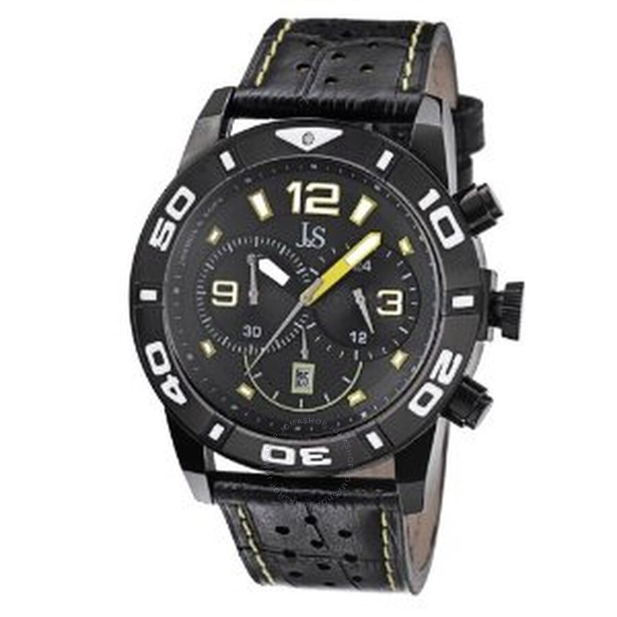 Black ion-plated stainless steel case with a black leather strap. Fixed black ion-plated bezel. Black dial with luminous black and yellow hands and index hour markers. Arabic numerals mark the 3, 9 and 12 o'clock positions. Minute markers around the outer rim. Dial Type: Analog. Luminescent hands and hour markers. Date display above the 6 o'clock position. Chronograph - three sub-dials displaying: 60 second, 60 minute timer, and 24 hour. Quartz movement. Scratch resistant mineral crystal. Screw down case back. Case diameter: 52 mm. Case thickness: 19 mm. Round case shape. Band width: 27 mm. Band length: 9 inches. Tang clasp. Water resistant at 50 meters / 165 feet. Functions: chronograph, hour, minute, second. Casual watch style. Watch label: Hong Kong. Joshua Sons Chronograph Black Dial Black Leather Men's Watch JS60YL. INFORMATION Brand: Joshua And Sons Gender: Mens Model: JS60YL Watch Label: Hong Kong Movement: Quartz CASE Case Size: 52 mm Case Thickness: 19 mm Case Material: Stainless Steel Case Shape: Round Case Back: Screw Down BAND Band Material: Leather Band Type: Strap Band Color: Black Band Length: 9 inches Band Width: 27 mm Clasp: Tang DIAL Dial Color: Black Type: Analog Crystal: Scratch Resistant Mineral Hands: Luminous Black and Yellow Dial Markers: Index Second Markers: Arabic Numerals mark the 3, 9 and 12 o'clock positions. Minute Markers around the outer rim Sub Dials: Three - 60 Second, 60 Minute and 24 Hour Luminiscence: Hands and Hour Markers Bezel: Fixed Bezel Color: Black Ion-plated Bezel Material: Stainless Steel FEATURES Water Resistance: 50 meters / 165 feet Calendar: Date display above the 6 o'clock position Functions: Chronograph, Hour, Minute, Second Watch Features: Chronograph, Stainless Steel, Leather, Analog ADDITIONAL INFO Watch Style: Casual Warranty: With Manufacturers Guarantee UPC Code: 848572026673 Jomashop Sku: JO-JS60YL Department: Watches Category: Watches