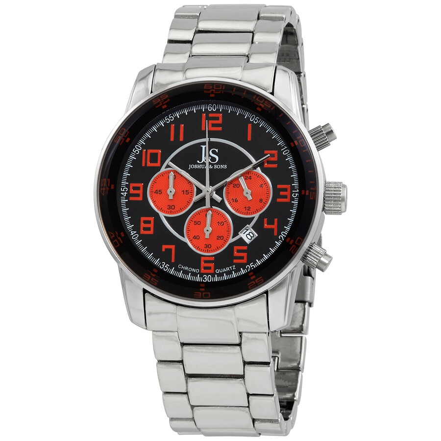 Silver-tone alloy case with a silver-tone alloy bracelet. Fixed black bezel. Black dial with silver-tone hands and Arabic numeral hour markers. Minute markers around the outer rim. Dial Type: Analog. Date display between 4 and 5 o'clock position. Chronograph - three brown sub-dials displaying: 60 second, 60 minute and 24 hour. Quartz movement. Scratch resistant mineral crystal. Screw down case back. Case diameter: 48 mm. Case thickness: 17 mm. Round case shape. Band width: 25 mm. Band length: 9 inches. Fold over clasp with safety release. Water resistant at 10 meters / 33 feet. Functions: chronograph, date, hour, minute, second. Casual watch style. Watch label: Hong Kong. Joshua Sons Chronograph Black Dial Silver-tone Alloy Men's Watch JS67OR. INFORMATION Brand: Joshua And Sons Gender: Mens Model: JS67OR Watch Label: Hong Kong Movement: Quartz CASE Case Size: 48 mm Case Thickness: 17 mm Case Material: Alloy Case Shape: Round Case Back: Screw Down BAND Band Material: Alloy Band Type: Bracelet Band Color: Silver-tone Band Length: 9 inches Band Width: 25 mm Clasp: Fold Over with Safety Release DIAL Dial Color: Black Type: Analog Crystal: Scratch Resistant Mineral Hands: Silver-tone Dial Markers: Arabic Numeral Second Markers: Minute Markers around the outer rim Sub Dials: Three - 60 Second, 60 Minute and 24 Hour Bezel: Fixed Bezel Color: Black FEATURES Water Resistance: 10 meters / 33 feet Calendar: Date display between 4 and 5 o'clock position Functions: Chronograph, Date, Hour, Minute, Second Watch Features: Chronograph, Analog ADDITIONAL INFO Watch Style: Casual Warranty: With Manufacturers Guarantee UPC Code: 848572029773 Jomashop Sku: JO-JS67OR Department: Watches Category: Watches