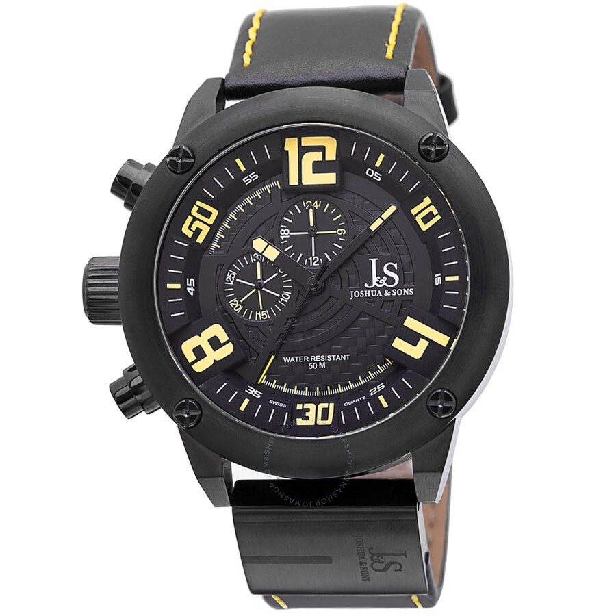Black ion-plated stainless steel case with a black (calfskin) leather strap. Fixed black ion-plated bezel. Black dial with luminous black hands and index hour markers. Arabic numerals mark the 4, 8 and 12 o'clock positions. Minute markers around the outer rim. Dial Type: Analog. Luminescent hands and markers. Two multi-function sub-dials displaying: date and 24 hour (GMT). Quartz movement. Scratch resistant mineral crystal. Screw down case back. Case diameter: 50 mm. Case thickness: 14 mm. Round case shape. Band width: 24 mm. Tang clasp. Water resistant at 50 meters / 165 feet. Functions: date, GMT, second time zone, hour, minute, second. Casual watch style. Watch label: Hong Kong. Joshua Sons Multifunction Black Dial Black Leather Men's Watch JS70YL. INFORMATION Brand: Joshua And Sons Gender: Mens Model: JS70YL Watch Label: Hong Kong Movement: Quartz CASE Case Size: 50 mm Case Thickness: 14 mm Case Material: Stainless Steel Case Shape: Round Case Back: Screw Down BAND Band Material: Calfskin Leather Band Type: Strap Band Color: Black Band Width: 24 mm Clasp: Tang DIAL Dial Color: Black Type: Analog Crystal: Scratch Resistant Mineral Hands: Luminous Black Dial Markers: Index Second Markers: Arabic Numerals mark the 4, 8 and 12 o'clock positions. Minute Markers around the outer rim Sub Dials: Two - Date and 24 Hour Luminiscence: Hands and Markers Bezel: Fixed Bezel Color: Black Ion-plated FEATURES Water Resistance: 50 meters / 165 feet Functions: Date, GMT, Second Time Zone, Hour, Minute, Second Watch Features: Time Zone, Stainless Steel, Leather, GMT, Analog ADDITIONAL INFO Watch Style: Casual Warranty: With Manufacturers Guarantee UPC Code: 848572031967 Jomashop Sku: JO-JS70YL Department: Watches Category: Watches