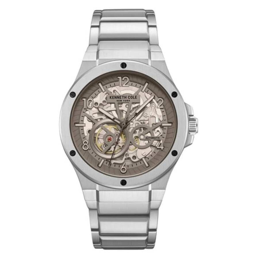 Silver-tone stainless steel case and bracelet. Fixed silver-tone stainless steel bezel. Brown dial with brown hands and index-Arabic numeral hour markers. Minute markers around the outer rim. Dial Type: Analog. Automatic movement. Scratch resistant mineral crystal. Pull / push crown. Transparent see through case back. Round case shape, case size: 42 mm. Deployment with push button release clasp. Water resistant at 50 meters / 165 feet. Functions: hour, minute, second. Casual watch style. Kenneth Cole New York Automatic Brown Dial Men's Watch KCWGY0063302. GENERAL Box Type: Original Box CASE Case Material: Stainless Steel Case Shape: Round Case Back: Transparent See Through BAND Band Material: Stainless Steel Band Type: Bracelet Band Color: Silver-tone Clasp: Deployment with Push Button Release DIAL Dial Color: Brown Type: Analog Crystal: Scratch Resistant Mineral Hands: Brown Dial Markers: Index-Arabic Numeral Second Markers: Minute Markers around the outer rim Bezel: Fixed Bezel Color: Silver-tone Bezel Material: Stainless Steel Crown: Pull / Push INFORMATION Brand: Kenneth Cole New York Gender: Mens Model: KCWGY0063302 Movement: Automatic FEATURES Water Resistance: 50 meters / 165 feet Functions: Hour, Minute, Second Watch Features: Stainless Steel, Analog ADDITIONAL INFO Watch Style: Casual Jomashop Sku: Z-ALD4W Department: Watches