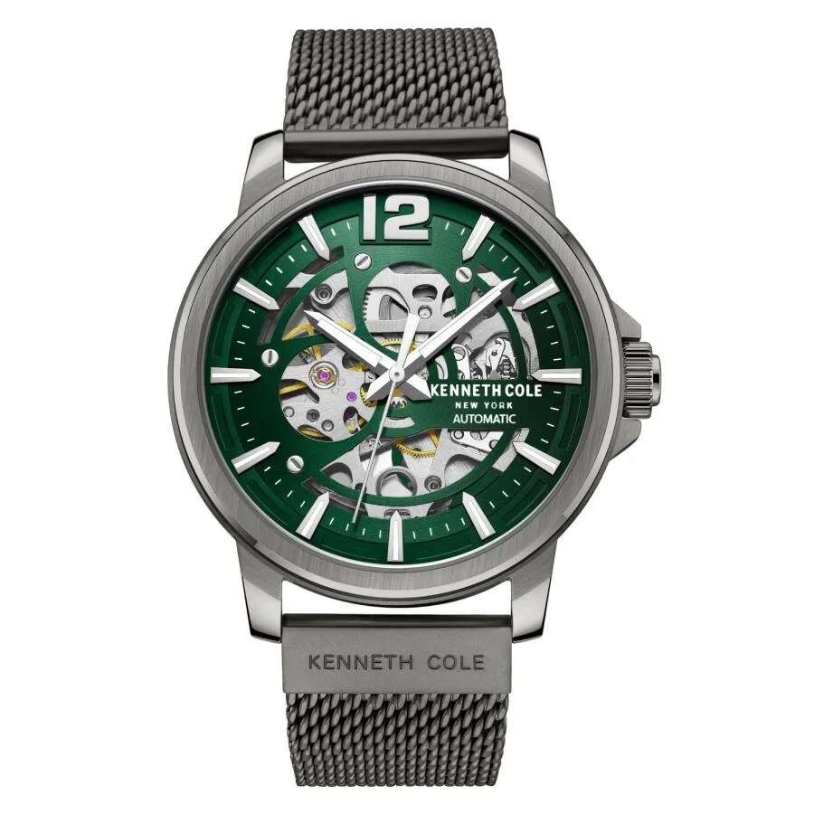 Gunmetal IP stainless steel case with a gunmetal IP stainless steel mesh bracelet. Fixed gunmetal IP stainless steel bezel. Green dial with silver-tone hands and index-Arabic numeral hour markers. Minute markers around the outer rim. Dial Type: Analog. Automatic movement. Scratch resistant mineral crystal. Pull / push crown. Transparent see through case back. Round case shape, case size: 44 mm. Fold over clasp. Water resistant at 50 meters / 165 feet. Functions: hour, minute, second. Casual watch style. Kenneth Cole New York Automatic Green Dial Men's Watch KCWGL2220510. GENERAL Box Type: Original Box CASE Case Diameter: 44 mm Case Material: Stainless Steel Case Shape: Round Case Back: Transparent See Through BAND Band Material: Stainless Steel Mesh Band Type: Bracelet Band Color: Gunmetal IP Clasp: Fold Over DIAL Dial Color: Green Type: Analog Crystal: Scratch Resistant Mineral Hands: Silver-tone Dial Markers: Index-Arabic Numeral Second Markers: Minute Markers around the outer rim Bezel: Fixed Bezel Color: Gunmetal IP Bezel Material: Stainless Steel Crown: Pull / Push INFORMATION Brand: Kenneth Cole New York Gender: Mens Model: KCWGL2220510 Movement: Automatic FEATURES Water Resistance: 50 meters / 165 feet Functions: Hour, Minute, Second Watch Features: Stainless Steel, Analog ADDITIONAL INFO Watch Style: Casual UPC Code: 020571484436 Jomashop Sku: Z-PSYQD Department: Watches