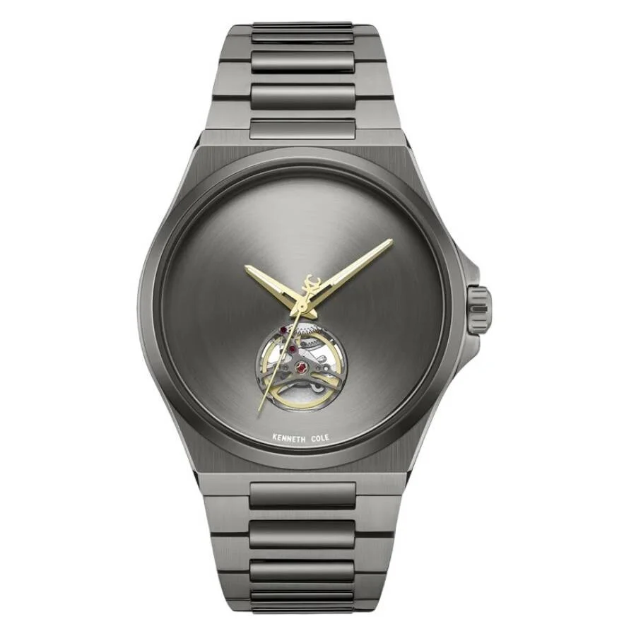 Gunmetal stainless steel case and bracelet. Fixed gunmetal stainless steel bezel. Gunmetal dial with gold-tone hands. No markers. Dial Type: Analog. Automatic movement. Scratch resistant mineral crystal. Pull / push crown. Transparent see through case back. Round case shape, case size: 43.5 mm. Deployment with push button release clasp. Water resistant at 50 meters / 165 feet. Functions: hour, minute, second. Casual watch style. Kenneth Cole New York Automatic Gunmetal Dial Men's Watch KCWGY0067403. GENERAL Box Type: Original Box CASE Case Diameter: 43.5 mm Case Material: Stainless Steel Case Shape: Round Case Back: Transparent See Through BAND Band Material: Stainless Steel Band Type: Bracelet Band Color: Gunmetal Clasp: Deployment with Push Button Release DIAL Dial Color: Gunmetal Type: Analog Crystal: Scratch Resistant Mineral Hands: Gold-tone Second Markers: No Markers Bezel: Fixed Bezel Color: Gunmetal Bezel Material: Stainless Steel Crown: Pull / Push INFORMATION Brand: Kenneth Cole New York Gender: Mens Model: KCWGY0067403 Movement: Automatic FEATURES Water Resistance: 50 meters / 165 feet Functions: Hour, Minute, Second Watch Features: Stainless Steel, Gold, Analog ADDITIONAL INFO Watch Style: Casual Jomashop Sku: Z-DPXZG Department: Watches