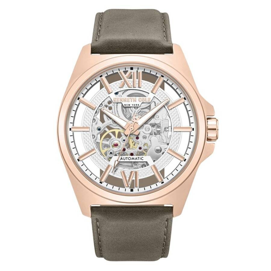 Rose gold-tone stainless steel case with a green leather strap. Fixed rose gold-tone stainless steel bezel. Skeleton dial with rose gold-tone hands and index-Roman numeral hour markers. Minute markers around the outer rim. Dial Type: Analog. Automatic movement. Scratch resistant mineral crystal. Pull / push crown. Transparent see through case back. Round case shape, case size: 44 mm, case thickness: 13 mm. Buckle clasp. Water resistant at 50 meters / 165 feet. Functions: hour, minute, second. Casual watch style. Kenneth Cole New York Automatic Skeleton Dial Men's Watch KCWGX0065101. GENERAL Box Type: Original Box CASE Case Thickness: 13 mm Case Material: Stainless Steel Case Shape: Round Case Back: Transparent See Through BAND Band Material: Leather Band Type: Strap Band Color: Green Clasp: Buckle DIAL Dial Color: Skeleton Type: Analog Crystal: Scratch Resistant Mineral Hands: Rose Gold-tone Dial Markers: Index-Roman Numeral Second Markers: Minute Markers around the outer rim Bezel: Fixed Bezel Color: Rose Gold-tone Bezel Material: Stainless Steel Crown: Pull / Push INFORMATION Brand: Kenneth Cole New York Gender: Mens Model: KCWGX0065101 Movement: Automatic FEATURES Water Resistance: 50 meters / 165 feet Functions: Hour, Minute, Second Watch Features: Stainless Steel, Leather, Gold, Analog ADDITIONAL INFO Watch Style: Casual Jomashop Sku: Z-N5DE3 Department: Watches