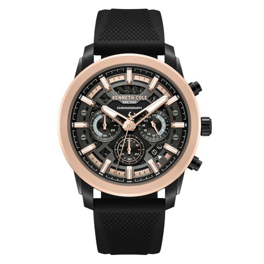 Black stainless steel case with a black silicone strap. Fixed rose gold-tone stainless steel bezel. Black dial with rose gold-tone hands and index hour markers. Minute markers around the outer rim. Dial Type: Analog. Luminescent hands and markers. Chronograph - three sub-dials displaying: 60 second, 60 minute and 24 hour. Quartz movement. Scratch resistant mineral crystal. Pull / push crown. Solid case back. Round case shape, case size: 44 mm. Buckle clasp. Water resistant at 50 meters / 165 feet. Functions: chronograph, hour, minute, second. Sport watch style. Kenneth Cole New York Chronograph Quartz Black Dial Men's Watch KCWGO0067702. GENERAL Box Type: Original Box CASE Case Material: Stainless Steel Case Shape: Round Case Back: Solid BAND Band Material: Silicone Band Type: Strap Band Color: Black Clasp: Buckle DIAL Dial Color: Black Type: Analog Crystal: Scratch Resistant Mineral Hands: Rose Gold-tone Dial Markers: Index Second Markers: Minute Markers around the outer rim Sub Dials: Three - 60 Second, 60 Minute and 24 Hour Luminiscence: Hands and Markers Bezel: Fixed Bezel Color: Rose Gold-tone Bezel Material: Stainless Steel Crown: Pull / Push INFORMATION Brand: Kenneth Cole New York Gender: Mens Model: KCWGO0067702 Movement: Quartz FEATURES Water Resistance: 50 meters / 165 feet Functions: Chronograph, Hour, Minute, Second Watch Features: Chronograph, Stainless Steel, Gold, Analog ADDITIONAL INFO Watch Style: Sport Jomashop Sku: Z-5DY8B Department: Watches
