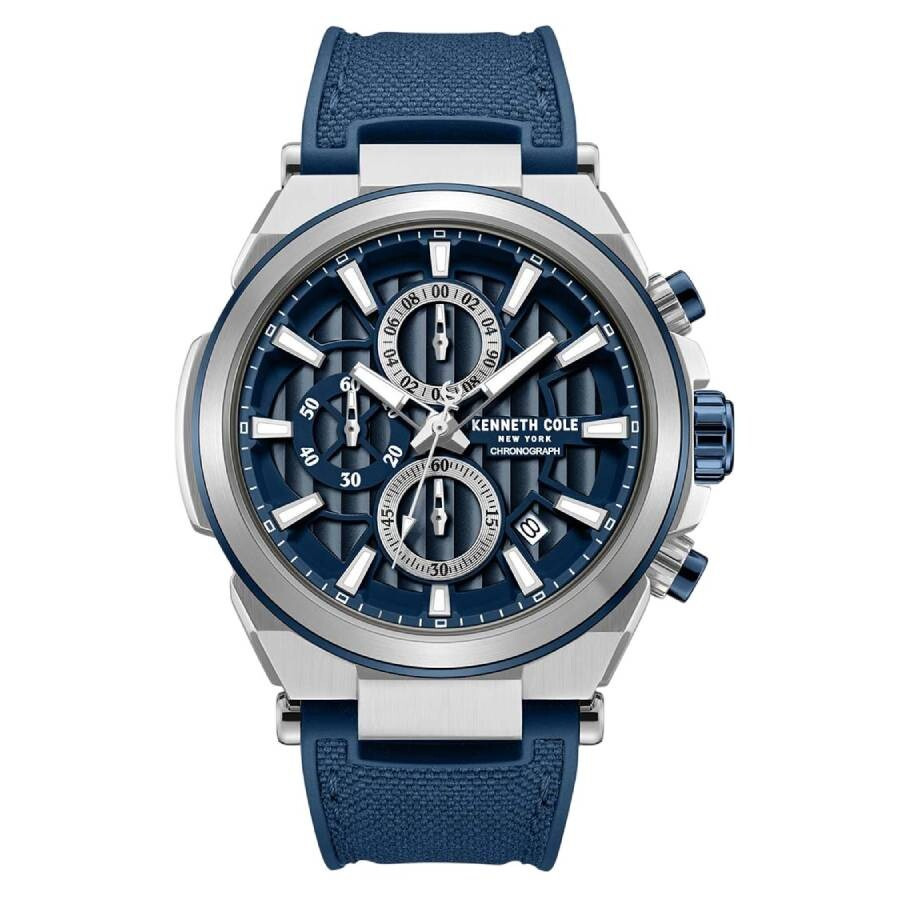 Silver-tone stainless steel case with a blue silicone strap. Fixed silver-tone stainless steel bezel. Blue dial with silver-tone hands and index hour markers. Minute markers around the outer rim. Dial Type: Analog. Luminescent hands and markers. Date display between 4 and 5 o'clock position. Chronograph - three sub-dials displaying: 60 second, 60 minute and 1/10th of a second. Quartz movement. Scratch resistant mineral crystal. Pull / push crown. Solid case back. Round case shape, case size: 42 mm. Buckle clasp. Water resistant at 50 meters / 165 feet. Functions: chronograph, date, hour, minute, second. Sport watch style. Kenneth Cole New York Chronograph Quartz Blue Dial Men's Watch KCWGO0065703. GENERAL Box Type: Original Box CASE Case Material: Stainless Steel Case Shape: Round Case Back: Solid BAND Band Material: Silicone Band Type: Strap Band Color: Blue Clasp: Buckle DIAL Dial Color: Blue Type: Analog Crystal: Scratch Resistant Mineral Hands: Silver-tone Dial Markers: Index Second Markers: Minute Markers around the outer rim Sub Dials: Three - 60 Second, 60 Minute and 1/10th of a Second Luminiscence: Hands and Markers Bezel: Fixed Bezel Color: Silver-tone Bezel Material: Stainless Steel Crown: Pull / Push INFORMATION Brand: Kenneth Cole New York Gender: Mens Model: KCWGO0065703 Movement: Quartz FEATURES Water Resistance: 50 meters / 165 feet Calendar: Date display between 4 and 5 o'clock position Functions: Chronograph, Date, Hour, Minute, Second Watch Features: Chronograph, Stainless Steel, Analog ADDITIONAL INFO Watch Style: Sport Jomashop Sku: Z-2W6AD Department: Watches