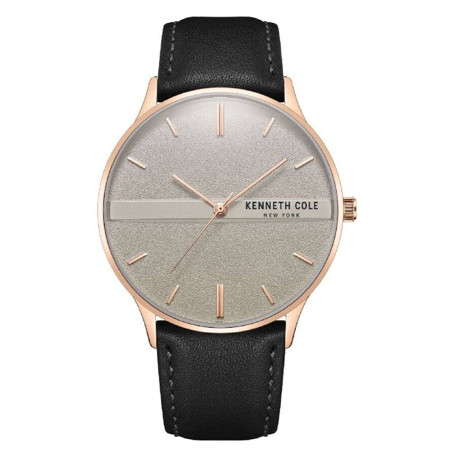 Rose gold-tone stainless steel case with a black leather strap. Fixed rose gold-tone stainless steel bezel. Grey dial with rose gold-tone hands and index hour markers. Dial Type: Analog. Quartz movement. Scratch resistant mineral crystal. Pull / push crown. Solid case back. Round case shape, case size: 42 mm. Buckle clasp. Water resistant at 30 meters / 100 feet. Functions: hour, minute, second. Casual watch style. Kenneth Cole New York Quartz Grey Dial Men's Watch KCWGA2234303. GENERAL Box Type: Original Box CASE Case Material: Stainless Steel Case Shape: Round Case Back: Solid BAND Band Material: Leather Band Type: Strap Band Color: Black Clasp: Buckle DIAL Dial Color: Grey Type: Analog Crystal: Scratch Resistant Mineral Hands: Rose Gold-tone Dial Markers: Index Bezel: Fixed Bezel Color: Rose Gold-tone Bezel Material: Stainless Steel Crown: Pull / Push INFORMATION Brand: Kenneth Cole New York Gender: Mens Model: KCWGA2234303 Movement: Quartz FEATURES Water Resistance: 30 meters / 100 feet Functions: Hour, Minute, Second Watch Features: Stainless Steel, Leather, Gold, Analog ADDITIONAL INFO Watch Style: Casual Jomashop Sku: Z-88LWH Department: Watches
