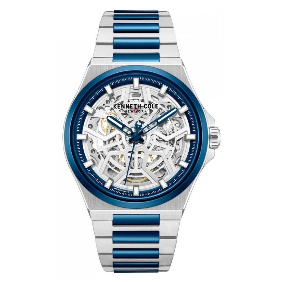 Silver-tone stainless steel case with a two-tone (silver-tone and blue) stainless steel bracelet. Fixed blue stainless steel bezel. Silver skeleton dial with blue hands and index hour markers. Minute markers around the outer rim. Dial Type: Analog. Automatic movement. Scratch resistant mineral crystal. Pull / push crown. Transparent see through case back. Round case shape, case size: 43 mm. Deployment with push button release clasp. Water resistant at 50 meters / 165 feet. Functions: hour, minute, second. Casual watch style. Kenneth Cole New York Skeleton Automatic Men's Watch KCWGY0065304. GENERAL Box Type: Original Box CASE Case Material: Stainless Steel Case Shape: Round Case Back: Transparent See Through BAND Band Material: Stainless Steel Band Type: Bracelet Band Color: Two-tone (Silver-tone and Blue) Clasp: Deployment with Push Button Release DIAL Dial Color: Silver Skeleton Type: Analog Crystal: Scratch Resistant Mineral Hands: Blue Dial Markers: Index Second Markers: Minute Markers around the outer rim Bezel: Fixed Bezel Color: Blue Bezel Material: Stainless Steel Crown: Pull / Push INFORMATION Brand: Kenneth Cole New York Gender: Mens Model: KCWGY0065304 Movement: Automatic FEATURES Water Resistance: 50 meters / 165 feet Functions: Hour, Minute, Second Watch Features: Stainless Steel, Analog ADDITIONAL INFO Watch Style: Casual Jomashop Sku: Z-3Y9NL Department: Watches