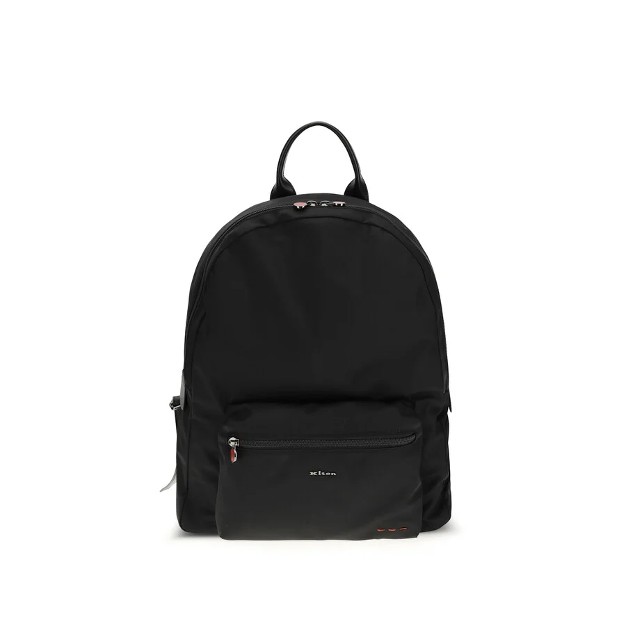 Kiton Men's Backpack. SKU: UBA0084N012700101G NERO. Size: W 34 x H 38 x D 12 cm. Kiton Nylon Backpack. The nylon backpack by kiton ciro paone is a practical yet refined accessory, distinguished by its metallic lettering logo that adds a touch of understated elegance. the design features a leather top handle, adjustable shoulder straps, and a secure zip closure. a front zip pocket enhances functionality, making it an ideal choice for everyday use.. Composition: 90% % Nylon, 10% % Acrylic GENERAL Size Info: W 34 x H 38 x D 12 cm INFORMATION Brand: Kiton Gender: Mens Model: UBA0084N012700101G NERO ADDITIONAL INFO Jomashop Sku: Z-EK6AU Department: Bags Category: Backpack
