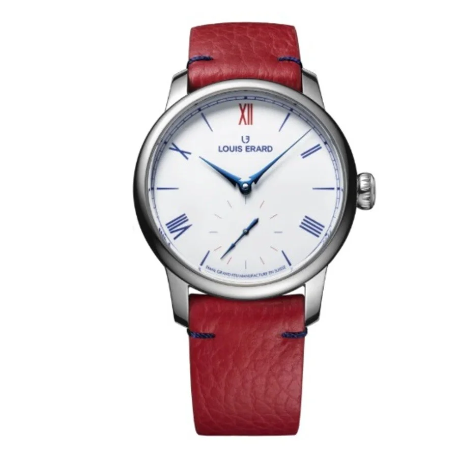 Silver-tone stainless steel case with a red leather strap. Fixed silver-tone stainless steel bezel. White dial with blue hands and Roman numeral & index hour markers. Minute markers around the outer rim. Dial Type: Analog. Sellita Caliber SW261-1 automatic movement with a 38-hour power reserve. Scratch resistant sapphire crystal. Transparent see through case back. Round case shape, case size: 39 mm. Buckle clasp. Water resistant at 50 meters / 165 feet. Functions: hour, minute, second. Excellence Series. Dress watch style. Watch label: Swiss Made. Louis Erard Excellence Email Grand Feu II Automatic White Dial Men's Watch 34238AA54.BVA95. GENERAL Box Type: Original Box CASE Case Diameter: 39 mm Case Material: Stainless Steel Case Shape: Round Case Back: Transparent See Through BAND Band Material: Leather Band Type: Strap Band Color: Red Clasp: Buckle DIAL Dial Color: White Type: Analog Crystal: Scratch Resistant Sapphire Hands: Blue Dial Markers: Roman Numeral & Index Second Markers: Minute Markers around the outer rim Bezel: Fixed Bezel Color: Silver-tone Bezel Material: Stainless Steel INFORMATION Brand: Louis Erard Series: Excellence Collection Name: Excellence Gender: Mens Model: 34238AA54.BVA95 Watch Label: Swiss Made Movement: Automatic Engine: Sellita Caliber SW261-1 Power Reserve: 38 hours FEATURES Water Resistance: 50 meters / 165 feet Functions: Hour, Minute, Second Watch Features: Analog, Leather, Stainless Steel ADDITIONAL INFO Watch Style: Dress Warranty: 2 Year Jomashop Warranty Jomashop Sku: LOU34238AA54-BVA95 Department: Watches Category: Watches