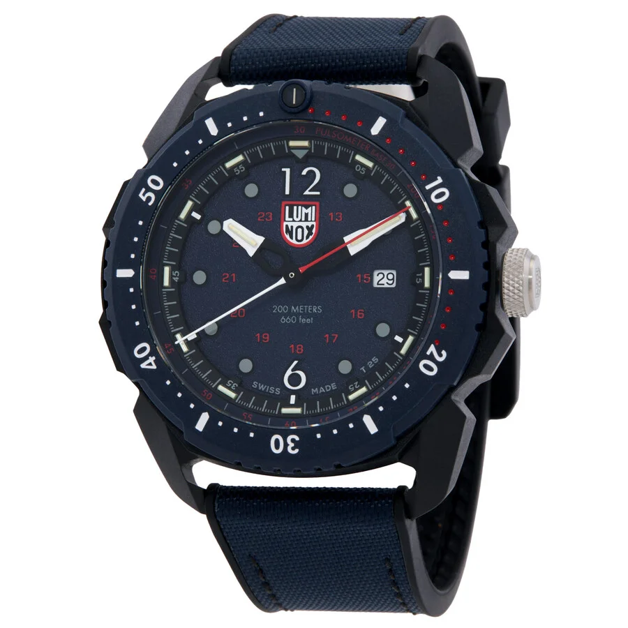 Blue carbon case with a blue rubber strap. Uni-directional rotating blue carbon bezel. Blue dial with luminous hands and index-Arabic numeral hour markers. Minute markers around the outer rim. Dial Type: Analog. Luminescent hands and markers. Date display at the 3 o'clock position. Ronda Caliber 515 quartz movement. Scratch resistant sapphire crystal. Screw down crown. Solid case back. Round case shape, case size: 46 mm, case thickness: 13 mm. Band width: 24 mm. Buckle clasp. Water resistant at 200 meters / 660 feet. Functions: date, hour, minute, second. Ice Sar Artic Series. Sport watch style. Watch label: Swiss Made. Luminox Ice Sar Artic Quartz Blue Dial Ladies Watch XL.1053. GENERAL Box Type: Original Box CASE Case Diameter: 46 mm Case Thickness: 13 mm Case Material: Carbon Case Shape: Round Case Back: Solid BAND Band Material: Rubber Band Type: Strap Band Color: Blue Band Width: 24 mm Clasp: Buckle DIAL Dial Color: Blue Type: Analog Crystal: Scratch Resistant Sapphire Hands: Luminous Dial Markers: Index-Arabic Numeral Second Markers: Minute Markers around the outer rim Luminiscence: Hands and Markers Bezel: Uni-directional Rotating Bezel Color: Blue Bezel Material: Carbon Crown: Screw Down INFORMATION Brand: Luminox Series: Ice Sar Artic Collection Name: Ice Sar Artic Gender: Womens Model: XL.1053 Watch Label: Swiss Made Movement: Quartz Engine: Ronda Caliber 515 FEATURES Water Resistance: 200 meters / 660 feet Calendar: Date display at the 3 o'clock position Functions: Date, Hour, Minute, Second Watch Features: Rubber, Analog ADDITIONAL INFO Watch Style: Sport Warranty: 2 Year Jomashop Warranty Jomashop Sku: LMXL1053 Department: Watches