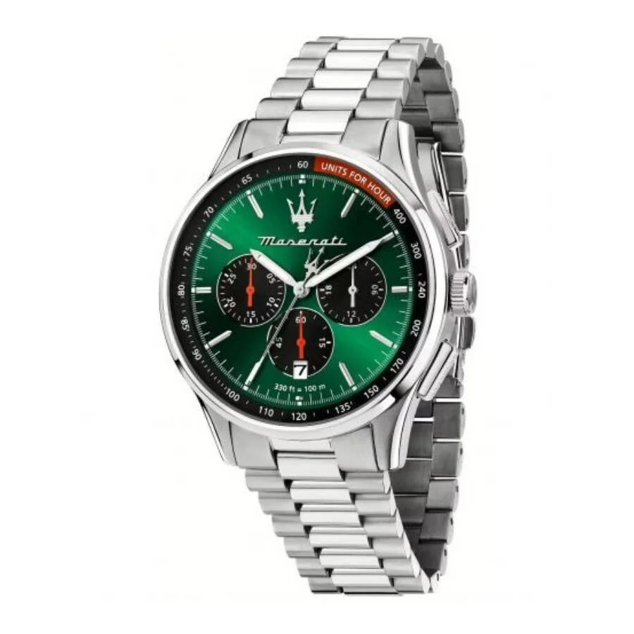 Silver-tone stainless steel case with a silver-tone steel + leather strap strap. Fixed black stainless steel bezel. Green, sunray dial with silver-tone hands and index hour markers. Minute markers around the outer rim. Dial Type: Analog. Date display at the 6 o'clock position. Chronograph - three sub-dials displaying: 60 second, 30 minute and 24 hour. Quartz movement. Scratch resistant mineral crystal. Screw down crown. Solid case back. Round case shape, case size: 42 mm, case thickness: 13.4 mm. Band width: 21 mm. Fold over clasp with a safety release. Water resistant at 100 meters / 330 feet. Functions: chronograph, date, hour, minute, second. Sorpasso Series. Dress watch style. Maserati Sorpasso Chronograph Quartz Men's Watch R8873624002. GENERAL Box Type: Original Box CASE Case Diameter: 42 mm Case Thickness: 13.4 mm Case Material: Stainless Steel Case Shape: Round Case Back: Solid BAND Band Material: Steel + Leather Strap Band Type: Strap Band Color: Silver-tone Band Width: 21 mm Clasp: Fold Over with Safety Release DIAL Dial Color: Green, Sunray Type: Analog Crystal: Scratch Resistant Mineral Hands: Silver-tone Dial Markers: Index Second Markers: Minute Markers around the outer rim Sub Dials: Three - 60 Second, 30 Minute and 24 Hour Bezel: Fixed Bezel Color: Black Bezel Material: Stainless Steel Crown: Screw Down INFORMATION Brand: Maserati Series: Sorpasso Collection Name: Sorpasso Gender: Mens Model: R8873624002 Movement: Quartz FEATURES Water Resistance: 100 meters / 330 feet Calendar: Date display at the 6 o'clock position Functions: Chronograph, Date, Hour, Minute, Second Watch Features: Analog, Leather, Stainless Steel, Chronograph ADDITIONAL INFO Watch Style: Dress Warranty: 2 Year Jomashop Warranty UPC Code: 8056783156382 Jomashop Sku: MSTI-R8873624002 Department: Watches