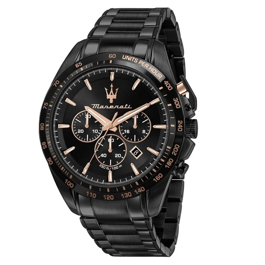 Black stainless steel case and bracelet. Fixed black stainless steel bezel. Black dial with rose gold-tone hands and index hour markers. Minute markers around the outer rim. Dial Type: Analog. Date display between 4 and 5 o'clock position. Chronograph - three sub-dials displaying: 60 second, 30 minute and 12 hour. Quartz movement. Scratch resistant mineral crystal. Pull / push crown. Solid case back. Round case shape, case size: 45 mm. Deployment with push button release clasp. Water resistant at 100 meters / 330 feet. Functions: chronograph, date, hour, minute, second. Traguardo Series. Casual watch style. Maserati Traguardo Chronograph Quartz Black Dial Men's Watch R8873612048. GENERAL Box Type: Original Box CASE Case Diameter: 45 mm Case Material: Stainless Steel Case Shape: Round Case Back: Solid BAND Band Material: Stainless Steel Band Type: Bracelet Band Color: Black Clasp: Deployment with Push Button Release DIAL Dial Color: Black Type: Analog Crystal: Scratch Resistant Mineral Hands: Rose Gold-tone Dial Markers: Index Second Markers: Minute Markers around the outer rim Sub Dials: Three - 60 Second, 30 Minute and 12 Hour Bezel: Fixed Bezel Color: Black Bezel Material: Stainless Steel Crown: Pull / Push INFORMATION Brand: Maserati Series: Traguardo Collection Name: Traguardo Gender: Mens Model: R8873612048 Movement: Quartz FEATURES Water Resistance: 100 meters / 330 feet Calendar: Date display between 4 and 5 o'clock position Functions: Chronograph, Date, Hour, Minute, Second Watch Features: Analog, Gold, Stainless Steel, Chronograph ADDITIONAL INFO Watch Style: Casual Warranty: 2 Year Jomashop Warranty UPC Code: 8033288983873 Jomashop Sku: MSTI-R8873612048 Department: Watches