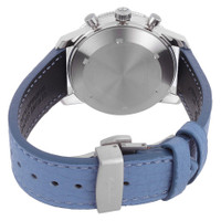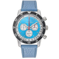 Silver-tone stainless steel case with a blue leather strap. Uni-directional rotating black stainless steel bezel. Blue dial with silver-tone hands and index hour markers. Minute markers around the outer rim. Dial Type: Analog. Luminescent hands and markers. Chronograph - three sub-dials displaying: 60 second, 30 minute and 12 hour. Caliber Landeron 73B automatic movement. Scratch resistant sapphire crystal. Pull / push crown. Round case shape, case size: 41 mm, case thickness: 16 mm. Band width: 20 mm. Water resistant at 50 meters / 165 feet. Functions: chronograph, hour, minute, second. 1968 Series. Sport watch style. Watch label: Swiss Made. Mathey-Tissot 1968 Chronograph Automatic Blue Dial Men's Watch H1968SK. GENERAL Box Type: Original Box CASE Case Thickness: 16 mm Case Material: Stainless Steel Case Shape: Round BAND Band Material: Leather Band Type: Strap Band Color: Blue Band Width: 20 mm DIAL Dial Color: Blue Type: Analog Crystal: Scratch Resistant Sapphire Hands: Silver-tone Dial Markers: Index Second Markers: Minute Markers around the outer rim Sub Dials: Three - 60 Second, 30 Minute and 12 Hour Luminiscence: Hands and Markers Bezel: Uni-directional Rotating Bezel Color: Black Bezel Material: Stainless Steel Crown: Pull / Push INFORMATION Brand: Mathey-Tissot Series: 1968 Collection Name: 1968 Gender: Mens Model: H1968SK Watch Label: Swiss Made Movement: Automatic Engine: Caliber Landeron 73B FEATURES Water Resistance: 50 meters / 165 feet Functions: Chronograph, Hour, Minute, Second Watch Features: Analog, Leather, Stainless Steel, Chronograph ADDITIONAL INFO Watch Style: Sport Jomashop Sku: MYT-H1968SK Item Variation: TYPE1968SK Department: Watches