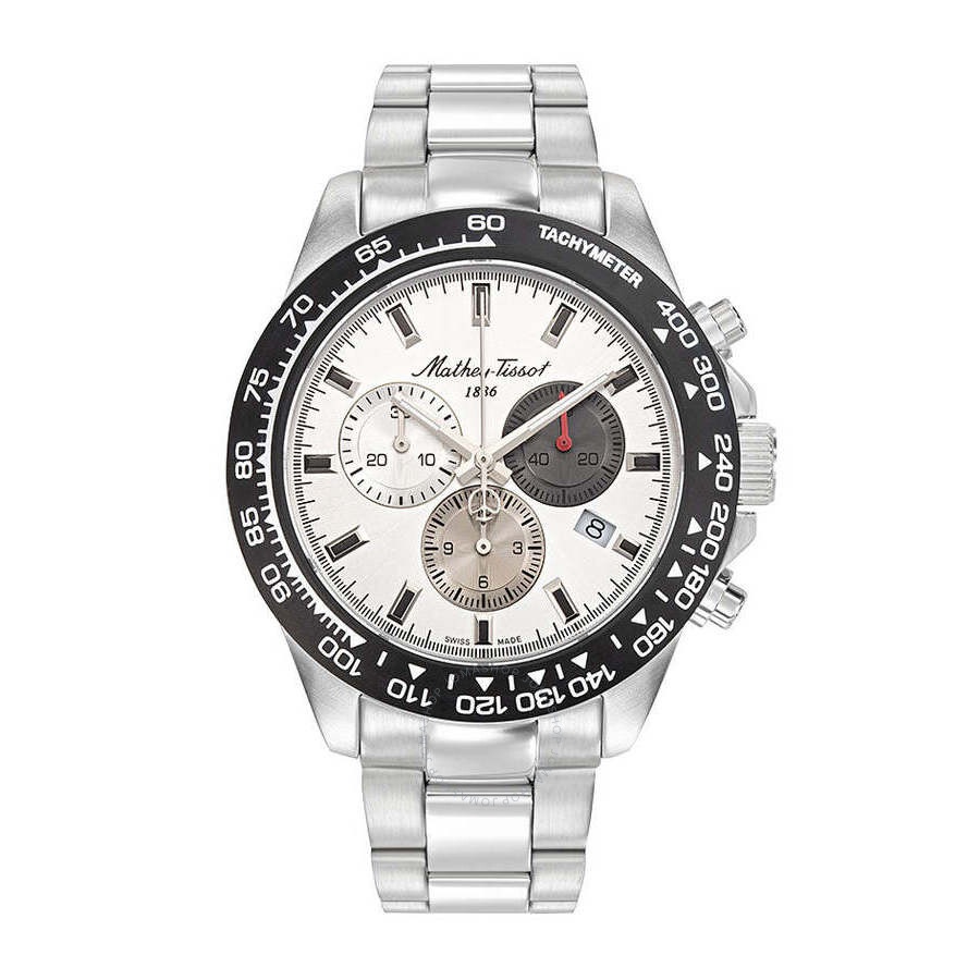 Silver-tone stainless steel case and bracelet. Fixed tachymeter scale black stainless steel bezel. White dial with silver-tone hands and index hour markers. Minute markers around the outer rim. Dial Type: Analog. Luminescent hands and markers. Date display at the 4 o'clock position. Chronograph - three sub-dials displaying: 60 second, 30 minute and 12 hour. Ronda Caliber 5030.D quartz movement. Scratch resistant sapphire crystal. Pull / push crown. Solid case back. Round case shape, case size: 42 mm. Fold over clasp. Water resistant at 100 meters / 330 feet. Functions: chronograph, date, hour, minute, small second. Chrono II Series. Casual watch style. Watch label: Swiss Made. Mathey-Tissot Chrono II Chronograph Quartz White Dial Men's Watch H938CHAS. CASE Case Size: 42 Case Material: Stainless Steel Case Shape: Round Case Back: Solid BAND Band Material: Stainless Steel Band Type: Bracelet Band Color: Silver-tone Clasp: Fold Over DIAL Dial Color: White Type: Analog Crystal: Scratch Resistant Sapphire Hands: Silver-tone Dial Markers: Index Second Markers: Minute Markers around the outer rim Sub Dials: Three - 60 second, 30 minute and 12 hour Luminiscence: Hands and Markers Bezel: Fixed Tachymeter Scale Bezel Color: Black Bezel Material: Stainless Steel Crown: Pull / Push INFORMATION Brand: Mathey-Tissot Series: Chrono Ii Collection Name: Chrono II Gender: Mens Model: H938CHAS Watch Label: Swiss Made Movement: Quartz Engine: Ronda Caliber 5030.D FEATURES Water Resistance: 100 meters / 330 feet Calendar: Date display at the 4 o'clock position Functions: Chronograph, Date, Hour, Minute, Small Second Watch Features: Chronograph, Stainless Steel, Analog ADDITIONAL INFO Watch Style: Casual Warranty: With Manufacturers Guarantee Jomashop Sku: Y-A4ZPZ Department: Watches