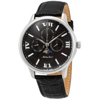 Stainless steel case with a black leather strap. Fixed stainless steel bezel. Black dial with silver-tone leaf-stylehands and index hour markers. Roman numerals mark the 3, 6, 9 and 12 o'clock positions. Minute markers around the outer rim. Dial Type: Analog. Date display at the 3 o'clock position. Four multi-function sub-dials displaying: date, day of the week, month, and moonphase. Ronda caliber 706.3 quartz movement. Scratch resistant sapphire crystal. Pull / push crown. Solid case back. Round case shape. Case size: 42 mm. Case thickness: 11 mm. Band width: 20 mm. Butterfly clasp. Water resistant at 50 meters / 165 feet. Functions: moon phase, month, date, day, hour, minute, second. Edmond Moon Series. Dress watch style. Watch label: Swiss Made. Mathey-Tissot Edmond Moon Phase Black Dial Men's Watch H1886RAN. INFORMATION Brand: Mathey-Tissot Series: Edmond Moon Collection Name: Edmond Moon Gender: Mens Model: H1886RAN Watch Label: Swiss Made Movement: Quartz Engine: Ronda Caliber 706.3 CASE Case Size: 42 mm Case Thickness: 11 mm Case Material: Stainless Steel Case Shape: Round Case Back: Solid BAND Band Material: Leather Band Type: Strap Band Color: Black Band Width: 20 mm Clasp: Butterfly DIAL Dial Color: Black Type: Analog Crystal: Scratch Resistant Sapphire Hands: Silver-tone Leaf-style Dial Markers: Index Second Markers: Roman Numerals mark the 3, 6, 9 and 12 o'clock positions. Minute Markers around the outer rim Sub Dials: Four - Date, Day of the week, Month and Moonphase Bezel: Fixed Bezel Color: Silver-tone Bezel Material: Stainless Steel Crown: Pull / Push FEATURES Water Resistance: 50 meters / 165 feet Calendar: Date display at the 3 o'clock position Functions: Moon Phase, Month, Date, Day, Hour, Minute, Second Watch Features: Moon Phase, Stainless Steel, Leather, Month, Analog ADDITIONAL INFO Watch Style: Dress Warranty: With Manufacturers Guarantee UPC Code: 842047133903 Jomashop Sku: MYT-H1886RAN Department: Watches Category: Watches