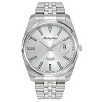 Silver-tone 316L stainless steel case and bracelet. Fixed silver-tone 316L stainless steel bezel. Silver-tone dial with light gold-tone hands and index hour markers. Minute markers around the outer rim. Dial Type: Analog. Luminescent hands and markers. Date display at the 3 o'clock position. day of the week display at the 6 o'clock position. Ronda Caliber 517 quartz movement. Scratch resistant sapphire crystal. Pull / push crown. Solid case back. Round case shape, case size: 41 mm, case thickness: 11 mm. Band width: 22 mm. Water resistant at 50 meters / 165 feet. Functions: date, day, hour, minute, second. Mathy Day-date Series. Dress watch style. Watch label: Swiss Made. Mathey-Tissot Mathy Day-Date Quartz Silver Dial Men's Watch H510AS. GENERAL Box Type: Original Box CASE Case Thickness: 11 mm Case Material: 316L Stainless Steel Case Shape: Round Case Back: Solid BAND Band Material: 316L Stainless Steel Band Type: Bracelet Band Color: Silver-tone Band Width: 22 mm DIAL Dial Color: Silver-tone Type: Analog Crystal: Scratch Resistant Sapphire Hands: Light Gold-tone Dial Markers: Index Second Markers: Minute Markers around the outer rim Luminiscence: Hands and Markers Bezel: Fixed Bezel Color: Silver-tone Bezel Material: 316L Stainless Steel Crown: Pull / Push INFORMATION Brand: Mathey-Tissot Series: Mathy Day-Date Collection Name: Mathy Day-Date Gender: Mens Model: H510AS Watch Label: Swiss Made Movement: Quartz Engine: Ronda Caliber 517 FEATURES Water Resistance: 50 meters / 165 feet Calendar: Date display at the 3 o'clock position. Day of the Week display at the 6 o'clock position Functions: Date, Day, Hour, Minute, Second Watch Features: Stainless Steel, Gold, Analog ADDITIONAL INFO Watch Style: Dress Jomashop Sku: MYT-H510AS Department: Watches