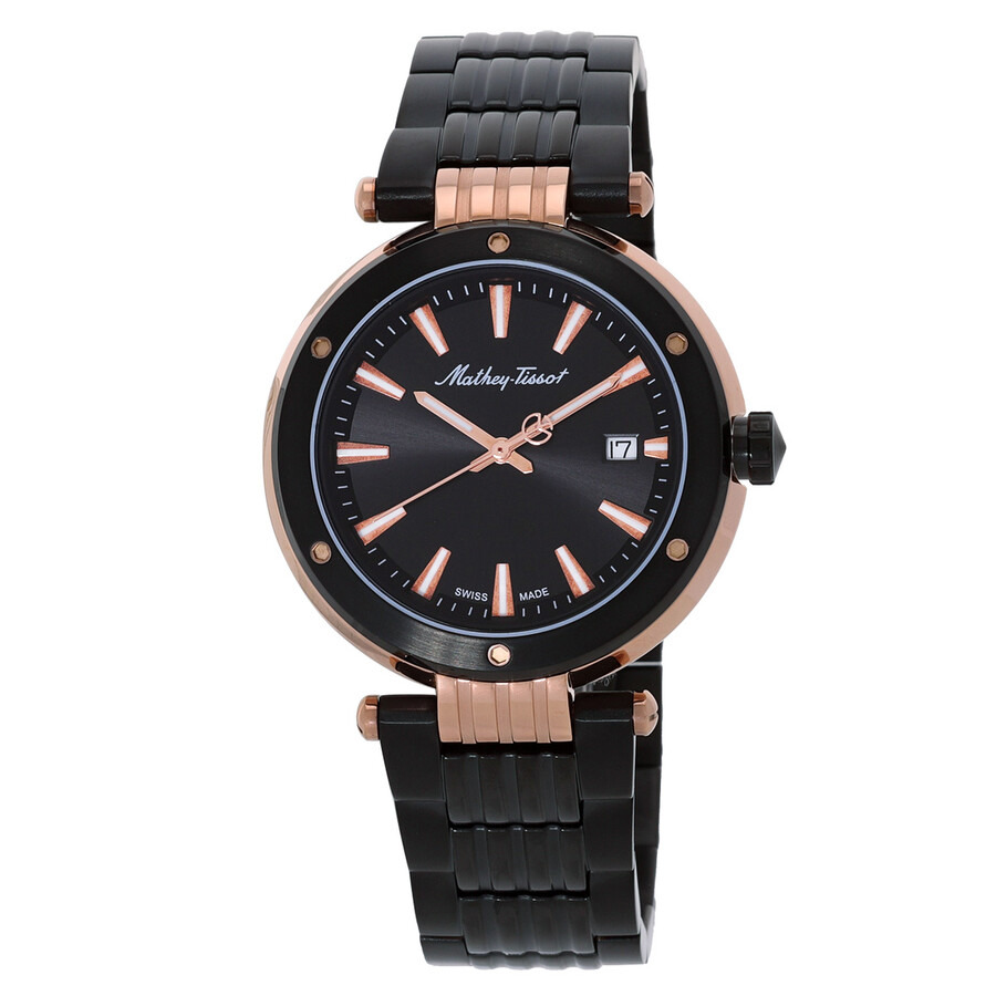 Mathey-Tissot Neptune Quartz Black Dial Men's Watch H912NR Black stainless steel case and bracelet. Fixed black stainless steel bezel. Black dial with rose gold-tone hands and index hour markers. Minute markers around the outer rim. Dial Type: Analog. Luminescent hands and markers. Date display at the 3 o'clock position. Ronda Caliber 515 quartz movement. Scratch resistant mineral crystal. Pull / push crown. Solid case back. Round case shape, case size: 42 mm. Fold over clasp with a safety release. Water resistant at 50 meters / 165 feet. Functions: date, hour, minute, second. Neptune Series. Casual watch style. Watch label: Swiss Made. Mathey-Tissot Neptune Quartz Black Dial Men's Watch H912NR. INFORMATION Brand: Mathey-Tissot Series: Neptune Collection Name: Neptune Gender: Mens Model: H912NR Watch Label: Swiss Made Movement: Quartz Engine: Ronda Caliber 515 CASE Case Size: 42 mm Case Material: Stainless Steel Case Shape: Round Case Back: Solid BAND Band Material: Stainless Steel Band Type: Bracelet Band Color: Black Clasp: Fold Over with Safety Release DIAL Dial Color: Black Type: Analog Crystal: Scratch Resistant Mineral Hands: Rose Gold-tone Dial Markers: Index Second Markers: Minute Markers around the outer rim Luminiscence: Hands and Markers Bezel: Fixed Bezel Color: Black Bezel Material: Stainless Steel Crown: Pull / Push FEATURES Water Resistance: 50 meters / 165 feet Calendar: Date Display at the 3 o'clock position Functions: Date, Hour, Minute, Second Watch Features: Stainless Steel, Gold, Analog ADDITIONAL INFO Watch Style: Casual Warranty: With Manufacturers Guarantee Jomashop Sku: Y-A4953 Department: Watches Category: Watches