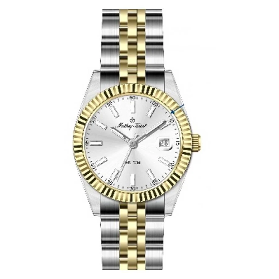 Silver-tone stainless steel case with a two-tone (silver-tone and gold-tone) stainless steel bracelet. Fixed gold-tone stainless steel bezel. Silver dial with silver-tone hands and index hour markers. Minute markers around the outer rim. Dial Type: Analog. Date display at the 3 o'clock position. Caliber VJ22 quartz movement. Scratch resistant mineral crystal. Pull / push crown. Solid case back. Round case shape, case size: 26 mm. Deployment with push button release clasp. Water resistant at 50 meters / 165 feet. Functions: date, hour, minute, second. Dress watch style. Watch label: Japan Movt. Mathey-Tissot Quartz Silver Dial Ladies Watch H250955C-A. GENERAL Box Type: Original Box CASE Case Diameter: 26 mm Case Material: Stainless Steel Case Shape: Round Case Back: Solid BAND Band Material: Stainless Steel Band Type: Bracelet Band Color: Two-tone (Silver-tone and Gold-tone) Clasp: Deployment with Push Button Release DIAL Dial Color: Silver Type: Analog Crystal: Scratch Resistant Mineral Hands: Silver-tone Dial Markers: Index Second Markers: Minute Markers around the outer rim Bezel: Fixed Bezel Color: Gold-tone Bezel Material: Stainless Steel Crown: Pull / Push INFORMATION Brand: Mathey-Tissot Gender: Womens Model: H250955C-A Watch Label: Japan Movt Movement: Quartz Engine: Caliber VJ22 FEATURES Water Resistance: 50 meters / 165 feet Calendar: Date display at the 3 o'clock position Functions: Date, Hour, Minute, Second Watch Features: Stainless Steel, Gold, Analog ADDITIONAL INFO Watch Style: Dress Warranty: With Manufacturers Guarantee Jomashop Sku: MYT-H250955C-A Department: Watches