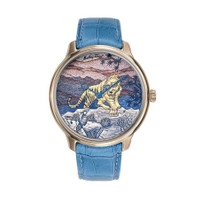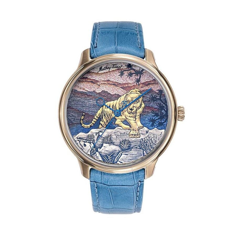 Rose gold-tone stainless steel case with a blue leather strap. Fixed rose gold-tone bezel. 3D tiger dial with blue hands. No markers. Dial Type: Analog. Automatic movement. Scratch resistant sapphire crystal. Pull / push crown. Transparent case back. Round case shape. Case size: 42 mm. Case thickness: 11.8 mm. Deployment clasp with a push button release. Water resistant at 50 meters / 165 feet. Functions: hour, minute, second. Additional Info: 3D tiger 18k gold. Tiger Limited Edition Series. Dress watch style. Watch label: Swiss Made. Mathey-Tissot Tiger Limited Edition Multi-Color Dial Men's Watch H1886TP. INFORMATION Brand: Mathey-Tissot Series: Tiger Limited Edition Collection Name: Tiger Limited Edition Gender: Mens Model: H1886TP Watch Label: Swiss Made Movement: Automatic CASE Case Size: 42 mm Case Thickness: 11.8 mm Case Material: Stainless Steel Case Shape: Round Case Back: Transparent BAND Band Material: Leather Band Type: Strap Band Color: Blue Clasp: Deployment with Push Button Release DIAL Dial Color: 3D Tiger Type: Analog Crystal: Scratch Resistant Sapphire Hands: Blue Second Markers: No markers Bezel: Fixed Bezel Color: Rose Gold-tone Bezel Material: Stainless Steel Crown: Pull / Push FEATURES Water Resistance: 50 meters / 165 feet Functions: Hour, Minute, Second Watch Features: Stainless Steel, Leather, Gold, Analog ADDITIONAL INFO Watch Style: Dress Warranty: With Manufacturers Guarantee UPC Code: 7640331943633 Additional Info: 3D Tiger 18k Gold Jomashop Sku: Y-172808 Department: Watches Category: Watches