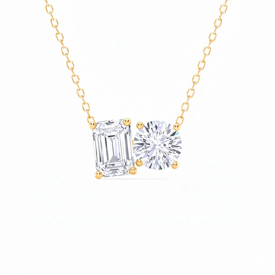 Celebrate everlasting connection with the Mauli Jewels 2.00 Carat Lab Grown Diamond Toi Et Moi Pendant Necklace, an elegant symbol of unity and modern romance. Designed in luminous 14K white gold and yellow gold this pendant features two stunning lab grown diamonds—one 7x5mm emerald cut (1.00 Ct) and one 6.5mm round cut (1.00 Ct)—totaling 2.00 carats of brilliance. Each diamond showcases exceptional sparkle and EF-VS1 clarity, reflecting sophistication and timeless charm. The Toi Et Moi (You and Me) design beautifully merges two unique shapes, symbolizing harmony and balance in relationships. Suspended from a gold cable chain, this necklace exudes versatility and grace, perfect for both everyday elegance and special occasions. Thoughtfully designed, it’s a meaningful piece that captures love, light, and individuality. GENERAL Stone Shape: Emerald Color: Yellow Collection Name: Lb-Grown Diamond Necklace INFORMATION Brand: Maulijewels Series: Lb-Grown Diamond Necklace Gender: Womens Model: 7565EMRDYLB DETAILS Size Info: 18 inches Necklaces: Pendant Ring Style: Fashion Chain Type: Cable Closure Type: Spring Ring Material : Yellow Gold Metal Stamp: 14K Metal Weight: 2.85 Stone Type: Diamond Stone Weight: 1 Stone Color: E-F Stone Cut: Emerald Stone Clarity: VS1 Stone Origin: Lab Grown Total Stones: 2 ADDITIONAL INFO Jomashop Sku: Y-A5Q4Q Department: Jewelry Category: Necklaces