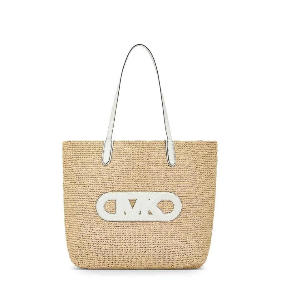 Michael Kors Ladies Tote. SKU: 30S4SZAT4O-884. Barcode: 196237768759. Color: White. Size: 18”W X 15”H X 5.5”D. Michael Kors Eliza Extra-Large Empire Logo Straw Tote Bag. The Eliza tote bag features an open top, a spacious interior compartment, dual top handles, and is finished with the signature MK logo on the front. 100% polypropylene GENERAL Size Info: 18”W X 15”H X 5.5”D Brand Type: Designer Color: White INFORMATION Brand: Michael Kors Gender: Womens Model: 30S4SZAT4O-884 DETAILS Material: Polypropylene Closure: Open ADDITIONAL INFO UPC Code: 196237768759 Jomashop Sku: Z-QSX84 Department: Bags Category: Tote Bags
