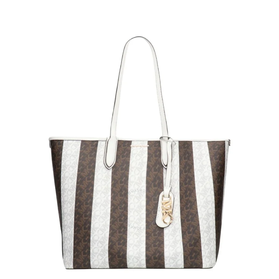 Michael Kors Ladies Tote. SKU: 30S4GZAT4B212. Color: Brown. Size: 32cm x 30cm x 14cm. Michael Kors Eliza Large Striped Tote Bag. This tote bag features all-over monogram prints, vertical lines engraving, logo letters, a hanging key chain, an open top design, two long top handles, a brand logo brooch, and a metal ornament. GENERAL Size Info: 32cm x 30cm x 14cm Color: Brown INFORMATION Brand: Michael Kors Gender: Womens Model: 30S4GZAT4B212 DETAILS Material: Canvas Closure: Open DIMENSIONS Size: Large ADDITIONAL INFO UPC Code: 196237765949 Jomashop Sku: Z-ZCU48 Department: Bags Category: Tote Bags