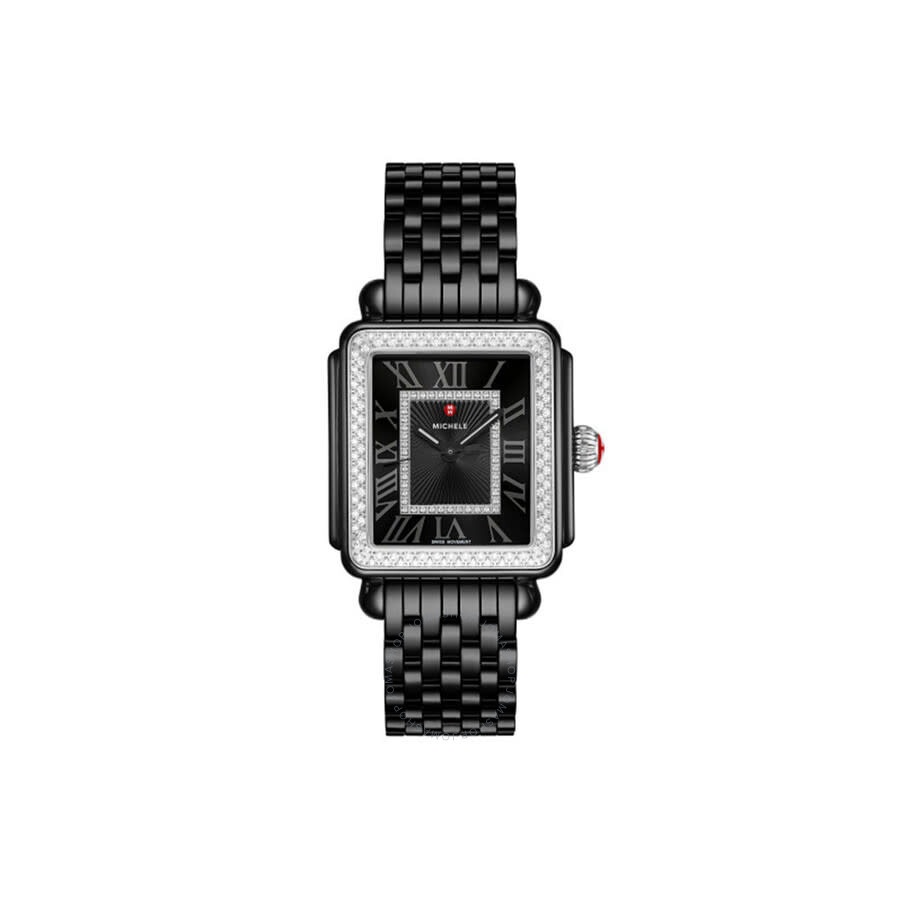 Black ceramic case and bracelet. Fixed bezel with diamond set. Black sunray dial with black hands and Roman numeral hour markers. Dial Type: Analog. Quartz movement. Scratch resistant sapphire crystal. Pull / push crown. Solid case back. Rectangle case shape, case size: 33 mm. Band width: 18 mm. Water resistant at 50 meters / 165 feet. Functions: hour, minute. Additional Info: total diamond count: 156 diamonds (0.71 cts). Deco Series. Dress watch style. Watch label: Swiss Movt. Michele Deco Quartz Diamond Black Sunray Dial Ladies Watch MWW06T000226. GENERAL Box Type: Original Box CASE Case Size: 33 Case Material: Ceramic Case Shape: Rectangle Case Back: Solid BAND Band Material: Ceramic Band Type: Bracelet Band Color: Black Band Width: 18 mm DIAL Dial Color: Black Sunray Type: Analog Crystal: Scratch Resistant Sapphire Hands: Black Dial Markers: Roman Numeral Bezel: Fixed Bezel Material: Diamond Set Crown: Pull / Push INFORMATION Brand: Michele Series: Deco Collection Name: Deco Gender: Womens Model: MWW06T000226 Watch Label: Swiss Movt Movement: Quartz FEATURES Water Resistance: 50 meters / 165 feet Functions: Hour, Minute Watch Features: Analog, Ceramic, Diamond ADDITIONAL INFO Watch Style: Dress Warranty: 2 Year Jomashop Warranty UPC Code: 099945533162 Additional Info: Total Diamond Count: 156 Diamonds (0.71 cts) Jomashop Sku: MWMWW06T000226 Department: Watches Category: Watches