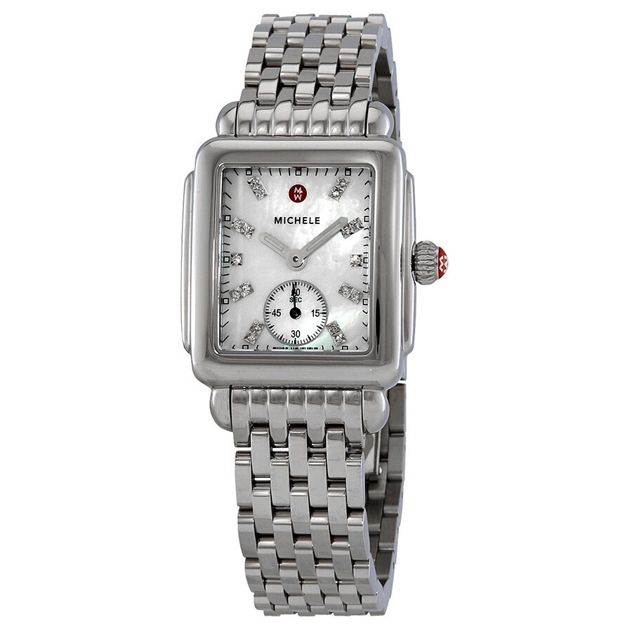 Stainless steel case with a stainless steel bracelet. Fixed stainless steel bezel. Mother of pearl dial with luminous hands and diamond-set index hour markers. Minute markers around the outer rim. Dial Type: Analog. Luminescent hands and markers. Small seconds sub-dial at the 6 o'clock position. Quartz movement. Scratch resistant sapphire crystal. Pull / push crown. Solid case back. Case dimensions: 31 mm x 29 mm. Case thickness: 8 mm. Square case shape. Band width: 16 mm. Band length: 8 inches. Deployment clasp. Water resistant at 50 meters / 165 feet. Functions: hours, minutes, small seconds. Additional Info: head: mw06v00a0046, strap:ms16dm235009. Dress watch style. Watch label: Swiss Movement. Michele Ladies Deco 16 Mother of Pearl Diamond Dial Watch MWW06V000002. GENERAL Color: Mother of pearl INFORMATION Brand: Michele Series: Deco 16 Collection Name: Deco 16 Gender: Womens Model: MWW06V000002 Watch Label: Swiss Movement Movement: Quartz CASE Case Size: 31 mm x 29 mm Case Thickness: 8 mm Case Material: Stainless Steel Case Shape: Square Case Back: Solid BAND Band Material: Stainless Steel Band Type: Bracelet Band Color: Silver-tone Band Length: 8 inches Band Width: 16 mm Clasp: Deployment DIAL Dial Color: Mother of Pearl Type: Analog Crystal: Scratch Resistant Sapphire Hands: Luminous Dial Markers: Diamond-set Index Second Markers: Minute Markers around the outer rim Sub Dials: Small Seconds Luminiscence: Hands and Markers Bezel: Fixed Bezel Color: Silver-tone Bezel Material: Stainless Steel Crown: Pull / Push FEATURES Water Resistance: 50 meters / 165 feet Functions: Hours, Minutes, Small Seconds Watch Features: Diamond, Stainless Steel, Analog ADDITIONAL INFO Watch Style: Dress Warranty: 2 Year Jomashop Warranty UPC Code: 099945418254 Additional Info: Head: MW06V00A0046, Strap:MS16DM235009 Jomashop Sku: MWW06V000002 Department: Watches Category: Watches