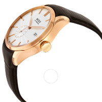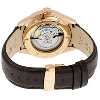 Rose gold PVD stainless steel case with a black leather strap. Fixed rose gold PVD bezel. Silver dial with rose gold-tone leaf-style hands and index hour markers. Dial Type: Analog. Date display at the 3 o'clock position. Seconds sub-dial at the 7 o'clock position. ETA caliber 2825-2 automatic movement, based upon ETA 2824-2, containing 25 Jewels, bitting at 28800 vph, and has a power reserve of approximately 42 hours. Scratch resistant sapphire crystal. Screw down crown. Transparent case back. Round case shape. Case size: 40 mm. Case thickness: 11.1 mm. Band width: 20 mm. Water resistant at 50 meters / 165 feet. Functions: date, hour, minute, second. Casual watch style. Watch label: Swiss Made. Mido Belluna Automatic Silver Dial Watch M024.428.36.031.00. INFORMATION Brand: Mido Series: Belluna Collection Name: Belluna Gender: Mens Model: M0244283603100 Watch Label: Swiss Made Movement: Automatic Engine: ETA Caliber 2825-2 Power Reserve: 42 hours CASE Case Size: 40 mm Case Thickness: 11.1 mm Case Material: Stainless Steel Case Shape: Round Case Back: Transparent BAND Band Material: Leather Band Type: Strap Band Color: Black Band Width: 20 mm Clasp: Deployment DIAL Dial Color: Silver Type: Analog Crystal: Scratch Resistant Sapphire Hands: Rose Gold-tone Leaf-style shape Dial Markers: Index Sub Dials: One - Small Second at the 7 o'clock position Bezel: Fixed Bezel Color: Rose Gold PVD Bezel Material: Stainless Steel Crown: Screw Down FEATURES Water Resistance: 50 meters / 165 feet Calendar: Date display at the 3 o'clock position Functions: Date, Hour, Minute, Second Watch Features: Stainless Steel, Leather, Gold, Analog ADDITIONAL INFO Watch Style: Casual Warranty: 2 Year Jomashop Warranty UPC Code: 7612330130871 Jomashop Sku: MIDO-M0244283603100 Department: Watches Category: Watches