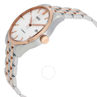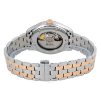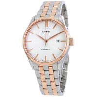 Stainless steel case with a two-tone (silver and rose gold PVD) stainless steel bracelet. Fixed rose gold PVD bezel. Silver dial with rose gold-tone hands and index hour markers. Dial Type: Analog. Date display at the 3 o'clock position. Mido calibre 80.611 automatic movement with an 80-hour power reserve. Scratch resistant sapphire crystal. Transparent case back. Case size: 40 mm. Case thickness: 11.01 mm. Round case shape. Band width: 20 mm. Deployment clasp. Water resistant at 50 meters / 165 feet. Functions: date, hour, minute, second. Dress watch style. Watch label: Swiss Made. Mido Belluna II Automatic Silver Dial Men's Watch M024.407.22.031.00. INFORMATION Brand: Mido Series: Belluna Ii Collection Name: Belluna II Gender: Mens Model: M0244072203100 Watch Label: Swiss Made Movement: Automatic Engine: Mido Calibre Powermatic 80 (ETA C07.611) Power Reserve: 80 hours CASE Case Size: 40 mm Case Thickness: 11.01 mm Case Material: Stainless Steel Case Shape: Round Case Back: Transparent BAND Band Material: Stainless Steel Band Type: Bracelet Band Color: Two-tone (Silver-tone and Rose Gold PVD) Band Width: 20 mm Clasp: Deployment DIAL Dial Color: Silver Type: Analog Crystal: Scratch Resistant Sapphire Hands: Rose Gold-tone Dial Markers: Index Bezel: Fixed Bezel Color: Rose Gold PVD Bezel Material: Stainless Steel FEATURES Water Resistance: 50 meters / 165 feet Calendar: Date display at the 3 o'clock position Functions: Date, Hour, Minute, Second Watch Features: Stainless Steel, Gold, Analog ADDITIONAL INFO Watch Style: Dress Warranty: 2 Year Jomashop Warranty UPC Code: 7612330131052 Jomashop Sku: MIDO-M0244072203100 Department: Watches Category: Watches