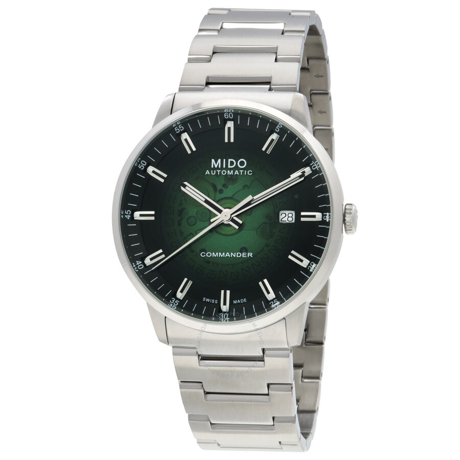 Silver-tone stainless steel case and bracelet. Fixed silver-tone stainless steel bezel. Green dial with silver-tone hands and index hour markers. Minute markers around the outer rim. Luminescent hands and markers. Date display at the 3 o'clock position. Caliber 80 automatic movement with an 80-hour power reserve. Scratch resistant sapphire crystal. Pull / push crown. Transparent see through case back. Round case shape, case size: 40 mm, case thickness: 10.8 mm. Band width: 21 mm. Fold over clasp with a safety release. Water resistant at 50 meters / 165 feet. Functions: hour, minute, second. Commander Gradient Series. Dress watch style. Watch label: Swiss Made. Mido Commander Gradient Automatic Green Dial Men's Watch M021.407.11.411.03. GENERAL Box Type: Original Box CASE Case Thickness: 10.8 mm Case Material: Stainless Steel Case Shape: Round Case Back: Transparent See Through BAND Band Material: Stainless Steel Band Type: Bracelet Band Color: Silver-tone Band Width: 21 mm Clasp: Fold Over with Safety Release DIAL Dial Color: Green Crystal: Scratch Resistant Sapphire Hands: Silver-tone Dial Markers: Index Second Markers: Minute Markers around the outer rim Luminiscence: Hands and Markers Bezel: Fixed Bezel Color: Silver-tone Bezel Material: Stainless Steel Crown: Pull / Push INFORMATION Brand: Mido Series: Commander Gradient Collection Name: Commander Gradient Gender: Mens Model: M021.407.11.411.03 Watch Label: Swiss Made Movement: Automatic Engine: Caliber 80 Power Reserve: 80 hours FEATURES Water Resistance: 50 meters / 165 feet Calendar: Date display at the 3 o'clock position Functions: Hour, Minute, Second Watch Features: Stainless Steel ADDITIONAL INFO Watch Style: Dress Warranty: 2 Year Jomashop Warranty UPC Code: 7612330153214 Jomashop Sku: MIDO-M0214071141103 Department: Watches