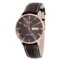 Rose gold-tone stainless steel case with a brown leather strap. Fixed rose gold-tone bezel. Grey dial with luminous rose gold-tone hands and index hour markers. Minute markers around the outer rim. Dial Type: Analog. Luminescent hands and markers. Day of the week and date display at the 3 o'clock position. Mido calibre Powermatic 80 (ETA C07.621) automatic movement, based upon ETA 2824-2, containing 23 Jewels, bitting at 21600 vph, and has a power reserve of approximately 80 hours. Scratch resistant sapphire crystal. Skeleton case back. Round case shape. Case size: 40 mm. Case thickness: 11.3 mm. Band width: 21 mm. Tang clasp. Water resistant at 50 meters / 165 feet. Functions: date, day, hour, minute, second, chronometer. Comander II Series. Casual watch style. Watch label: Swiss Made. Item Variations: MIDO M0214312606100, MIDO.M0214312606100, MIDOM0214312606100. Mido Commander II Grey Dial Maroon Leather Men's Watch M0214312606100. INFORMATION Brand: Mido Series: Comander Ii Collection Name: Comander II Gender: Mens Model: M0214312606100 Watch Label: Swiss Made Movement: Automatic Engine: Mido Calibre Powermatic 80 (ETA C07.621) Power Reserve: 80 hours CASE Case Size: 40 mm Case Thickness: 11.3 mm Case Material: Stainless Steel Case Shape: Round Case Back: Skeleton BAND Band Material: Leather Band Type: Strap Band Color: Brown Band Width: 21 mm Clasp: Tang DIAL Dial Color: Grey Type: Analog Crystal: Scratch Resistant Sapphire Hands: Luminous Rose Gold-tone Dial Markers: Index Second Markers: Minute Markers around the outer rim Luminiscence: Hands and Markers Bezel: Fixed Bezel Color: Rose Gold-tone Bezel Material: Stainless Steel FEATURES Water Resistance: 50 meters / 165 feet Calendar: Day of the Week and Date display at the 3 o'clock position Functions: Date, Day, Hour, Minute, Second, Chronometer Watch Features: Stainless Steel, Leather, Gold, Chronometer, Analog ADDITIONAL INFO Watch Style: Casual Warranty: 2 Year Jomashop Warranty UPC Code: 7612330130192 Jomashop Sku: MIDO-M0214312606100 Item Variation: MIDO M0214312606100, MIDO.M0214312606100, MIDOM0214312606100 Department: Watches Category: Watches