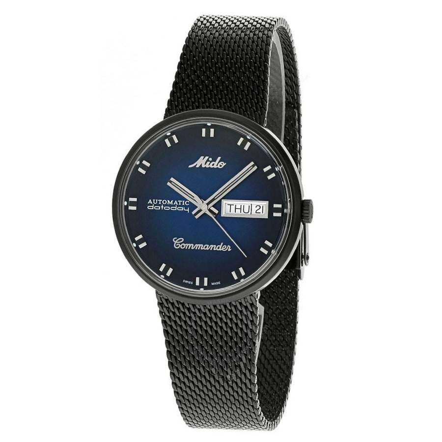 Black PVD stainless steel case and bracelet. Fixed black PVD stainless steel bezel. Blue dial with silver-tone hands and index hour markers. Dial Type: Analog. Day of the week and date display at the 3 o'clock position. Mido Calibre Powermatic 80 (ETA C07.621) Automatic movement, based upon ETA 2824-2, containing 23 Jewels, bitting at 21600 vph, and has a power reserve of approximately 80 hours. Scratch resistant acrylic glass crystal. Solid case back. Round case shape, case size: 37 mm, case thickness: 10.5 mm. Sliding clasp. Water resistant at 50 meters / 165 feet. Functions: date, day, hour, minute, second. Commander Series. Casual watch style. Watch label: Swiss Made. Mido Commander Shade Automatic Blue Dial Men's Watch M842932511. INFORMATION Brand: Mido Series: Commander Collection Name: Commander Gender: Mens Model: M842932511 Watch Label: Swiss Made Movement: Automatic Engine: Mido Calibre Powermatic 80 (ETA C07.621) Power Reserve: 80 hours CASE Case Size: 37 mm Case Thickness: 10.5 mm Case Material: Stainless Steel Case Shape: Round Case Back: Solid BAND Band Material: Stainless Steel Band Type: Bracelet Band Color: Black PVD Clasp: Sliding DIAL Dial Color: Blue Type: Analog Crystal: Acrylic glass Hands: Silver-tone Dial Markers: Index Bezel: Fixed Bezel Color: Black PVD Bezel Material: Stainless Steel FEATURES Water Resistance: 50 meters / 165 feet Calendar: Day of the Week and Date display at the 3 o'clock position Functions: Date, Day, Hour, Minute, Second Watch Features: Stainless Steel, Analog ADDITIONAL INFO Watch Style: Casual Warranty: 2 Year Jomashop Warranty UPC Code: 7612330138426 Jomashop Sku: MIDO-M842932511 Department: Watches