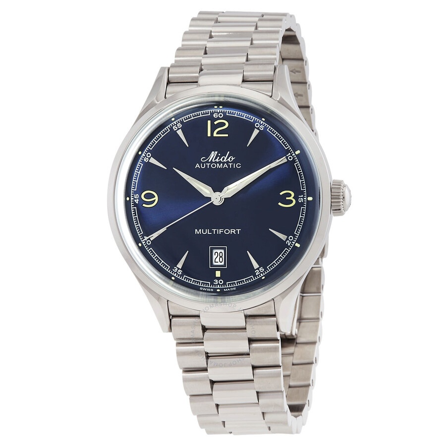 Silver-tone stainless steel case and bracelet. Fixed silver-tone stainless steel bezel. Blue dial with silver-tone hands and index-Arabic numeral hour markers. Minute markers around the outer rim. Dial Type: Analog. Date display at the 6 o'clock position. Automatic movement with an 80-hour power reserve. Scratch resistant sapphire crystal. Pull / push crown. Transparent case back. Round case shape, case size: 40 mm, case thickness: 12.1 mm. Band width: 19 mm. Folding clasp. Water resistant at 50 meters / 165 feet. Functions: date, hour, minute, second. Multifort Series. Casual watch style. Watch label: Swiss Made. Mido Multifort Automatic Blue Dial Men's Watch M0404071104700. CASE Case Size: 40 Case Thickness: 12.1 mm Case Material: Stainless Steel Case Shape: Round Case Back: Transparent BAND Band Material: Stainless Steel Band Type: Bracelet Band Color: Silver-tone Band Width: 19 mm Clasp: Folding DIAL Dial Color: Blue Type: Analog Crystal: Scratch Resistant Sapphire Hands: Silver-tone Dial Markers: Index-Arabic Numeral Second Markers: Minute Markers around the outer rim Bezel: Fixed Bezel Color: Silver-tone Bezel Material: Stainless Steel Crown: Pull / Push INFORMATION Brand: Mido Series: Multifort Collection Name: Multifort Gender: Mens Model: M0404071104700 Watch Label: Swiss Made Movement: Automatic Power Reserve: 80 hours FEATURES Water Resistance: 50 meters / 165 feet Calendar: Date display at the 6 o'clock position Functions: Date, Hour, Minute, Second Watch Features: Stainless Steel, Analog ADDITIONAL INFO Watch Style: Casual Warranty: 2 Year Jomashop Warranty UPC Code: 7612330144281 Jomashop Sku: MIDO-M0404071104700 Department: Watches