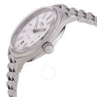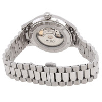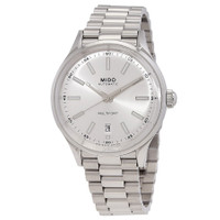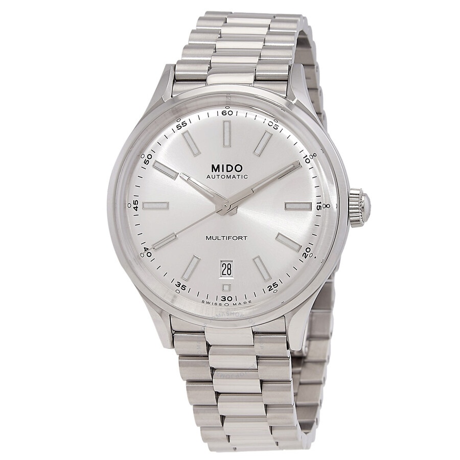 Silver-tone stainless steel case and bracelet. Fixed silver-tone stainless steel bezel. Silver dial with silver-tone hands and index hour markers. Minute markers around the outer rim. Dial Type: Analog. Luminescent hands and markers. Date display at the 6 o'clock position. Automatic movement with an 80-hour power reserve. Scratch resistant sapphire crystal. Pull / push crown. Transparent case back. Round case shape, case size: 40 mm, case thickness: 12.1 mm. Band width: 19 mm. Folding clasp. Water resistant at 50 meters / 165 feet. Functions: date, hour, minute, second. Multifort Series. Casual watch style. Watch label: Swiss Made. Mido Multifort Patrimony Powerwind Automatic Silver Dial Men's Watch M0404071103100. CASE Case Size: 40 Case Thickness: 12.1 mm Case Material: Stainless Steel Case Shape: Round Case Back: Transparent BAND Band Material: Stainless Steel Band Type: Bracelet Band Color: Silver-tone Band Width: 19 mm Clasp: Folding DIAL Dial Color: Silver Type: Analog Crystal: Scratch Resistant Sapphire Hands: Silver-tone Dial Markers: Index Second Markers: Minute Markers around the outer rim Luminiscence: Hands and Markers Bezel: Fixed Bezel Color: Silver-tone Bezel Material: Stainless Steel Crown: Pull / Push INFORMATION Brand: Mido Series: Multifort Collection Name: Multifort Gender: Mens Model: M0404071103100 Watch Label: Swiss Made Movement: Automatic Power Reserve: 80 hours FEATURES Water Resistance: 50 meters / 165 feet Calendar: Date display at the 6 o'clock position Functions: Date, Hour, Minute, Second Watch Features: Stainless Steel, Analog ADDITIONAL INFO Watch Style: Casual Warranty: 2 Year Jomashop Warranty Jomashop Sku: MIDO-M0404071103100 Department: Watches