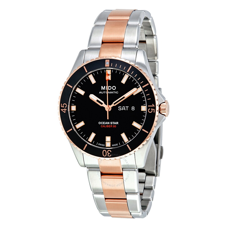 Stainless steel case with a two-tone (silver-tone and rose gold PVD) stainless steel bracelet. Uni-directional rotating rose gold PVD bezel with a black top ring. Black dial with luminous rose gold-tone hands and index hour markers. Minute markers around the outer rim. Dial Type: Analog. Luminescent hands and markers. Day of the week and date display at the 3 o'clock position. Mido calibre Powermatic 80 (ETA C07.621) automatic movement, based upon ETA 2824-2, containing 23 Jewels, bitting at 21600 vph, and has a power reserve of approximately 80 hours. Scratch resistant sapphire crystal. Screw down crown. Solid case back. Round case shape. Case size: 42.5 mm. Case thickness: 11.75 mm. Band width: 20 mm. Fold over clasp. Water resistant at 200 meters / 660 feet. Functions: date, day, hour, minute, second. Ocean star captain series. Casual watch style. Watch label: Swiss Made. Mido Ocean Star Captain Automatic Men's Watch M026.430.22.051.00. INFORMATION Brand: Mido Series: Ocean Star Captain Collection Name: Ocean Star Captain Gender: Mens Model: M0264302205100 Watch Label: Swiss Made Movement: Automatic Engine: Mido Calibre Powermatic 80 (ETA C07.621) Power Reserve: 80 hours CASE Case Size: 42.5 mm Case Thickness: 11.75 mm Case Material: Stainless Steel Case Shape: Round Case Back: Solid BAND Band Material: Stainless Steel Band Type: Bracelet Band Color: Two-tone (Silver-tone and Rose Gold PVD) Band Width: 20 mm Clasp: Fold Over DIAL Dial Color: Black Type: Analog Crystal: Scratch Resistant Sapphire Hands: Luminous Rose Gold-tone Dial Markers: Index Second Markers: Minute Markers around the outer rim Luminiscence: Hands and Markers Bezel: Uni-directional Rotating Bezel Color: Rose Gold PVD Bezel Material: Stainless Steel with a Black Top Ring Crown: Screw Down FEATURES Water Resistance: 200 meters / 660 feet Calendar: Day of the Week and Date display at the 3 o'clock position Functions: Date, Day, Hour, Minute, Second Watch Features: Stainless Steel, Gold, Analog ADDITIONAL INFO Watch Style: Casual Warranty: 2 Year Jomashop Warranty UPC Code: 7612330132547 Jomashop Sku: MIDO-M0264302205100 Department: Watches Category: Watches