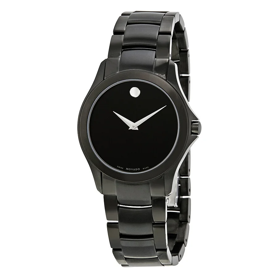Black ion-plated stainless steel case and bracelet. Fixed black ion-plated bezel. Black dial with silver-tone hands. No markers. The signuture Movado dot appears at the 12 o'clock position. Dial Type: Analog. Quartz movement. Scratch resistant sapphire crystal. Solid case back. Case diameter: 38 mm. Case thickness: 7 mm. Round case shape. Deployment clasp. Water resistant at 30 meters / 100 feet. Functions: hour, minute. Dress watch style. Watch label: Swiss Made. Movado Black Ion-plated Stainless Steel Museum Men's Watch 0606486. GENERAL Color: Black CASE Case Thickness: 7 mm Case Material: Stainless Steel Case Shape: Round Case Back: Solid BAND Band Material: Stainless Steel Band Type: Bracelet Band Color: Black Ion-plated Band Length: 7 inches Band Width: 23 mm Clasp: Deployment DIAL Dial Color: Black Type: Analog Crystal: Scratch Resistant Sapphire Hands: Silver-tone Dauphine-style shape Dial Markers: No Markers. The signature Movado concave dot appears at the 12 o'clock position Second Markers: No Markers. The signuture Movardo Dot appears at the 12 o'clock position Bezel: Fixed Bezel Color: Black Ion-plated Bezel Material: Stainless Steel Crown: Pull / Push INFORMATION Brand: Movado Series: Museum Collection Name: Museum Gender: Mens Model: 0606486 Watch Label: Swiss Made Movement: Quartz FEATURES Water Resistance: 30 meters / 100 feet Functions: Hour, Minute Watch Features: Stainless Steel ADDITIONAL INFO Watch Style: Dress Warranty: 2 Year Jomashop Warranty UPC Code: 845960045124 Jomashop Sku: MV0606486 Department: Watches Category: Watches