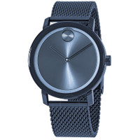 Blue ion-plated stainless steel case with a blue ion-plated stainless steel mesh bracelet. Fixed blue ion-plated bezel. Blue dial with blue hands. No markers. The Movado dot appears at the 12 o'clock position. Dial Type: Analog. Quartz movement. Scratch resistant K1 mineral crystal. Pull / push crown. Solid case back. Round case shape. Case size: 40 mm. Case thickness: 8.75 mm. Band width: 21 mm. Slip through clasp. Water resistant at 30 meters / 100 feet. Functions: hour, minute. Casual watch style. Movado Bold Blue Dial Men's Mesh Watch 3600610. GENERAL Box Type: Original Box CASE Case Size: 40 Case Thickness: 8.75 mm Case Material: Stainless Steel Case Shape: Round Case Back: Solid BAND Band Material: Stainless Steel Mesh Band Type: Bracelet Band Color: Blue Ion-plated Band Width: 21 mm Clasp: Slip Through DIAL Dial Color: Blue Type: Analog Crystal: Scratch Resistant K1 Mineral Hands: Blue Second Markers: No markers. Movado Dot appears at the 12 o'clock position Bezel: Fixed Bezel Color: Blue Ion-plated Bezel Material: Stainless Steel Crown: Pull / Push INFORMATION Brand: Movado Series: Bold Collection Name: Bold Gender: Mens Model: 3600610 Movement: Quartz FEATURES Water Resistance: 30 meters / 100 feet Functions: Hour, Minute Watch Features: Analog, Stainless Steel ADDITIONAL INFO Watch Style: Casual Warranty: 2 Year Jomashop Warranty UPC Code: 885997323680 Jomashop Sku: MV3600610 Department: Watches Category: Watches