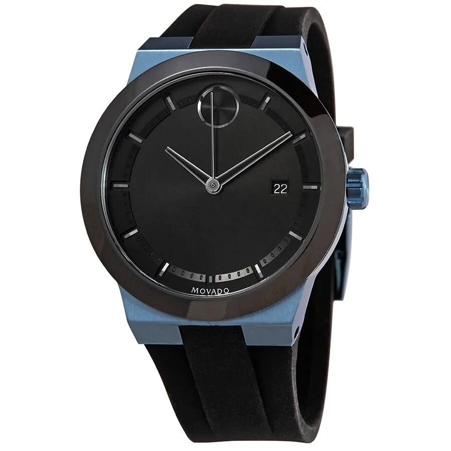 Blue ion-plated stainless steel case with a black silicone strap. Fixed black ceramic bezel. Black dial with silver-tone hands and index hour markers. Minute markers around the outer rim. The Movado dot appears at the 12 o'clock position. Dial Type: Analog. Date display at the 3 o'clock position. Quartz movement. Scratch resistant K1 mineral crystal. Pull / push crown. Solid case back. Round case shape. Case size: 42 mm. Case thickness: 10 mm. Band width: 24 mm. Tang clasp. Water resistant at 30 meters / 100 feet. Functions: date, hour, minute, second. Casual watch style. Movado Bold Quartz Black Dial Black Silicone Men's Watch 3600626. GENERAL Box Type: Original Box CASE Case Diameter: 42 mm Case Thickness: 10 mm Case Material: Stainless Steel Case Shape: Round Case Back: Solid BAND Band Material: Silicone Band Type: Strap Band Color: Black Band Width: 24 mm Clasp: Tang DIAL Dial Color: Black Type: Analog Crystal: Scratch Resistant K1 Mineral Hands: Silver-tone Dial Markers: Index Second Markers: Minute Markers around the outer rim. Movado Dot appears at the 12 o'clock position Bezel: Fixed Bezel Color: Black Bezel Material: Ceramic Crown: Pull / Push INFORMATION Brand: Movado Series: Bold Collection Name: Bold Gender: Mens Model: 3600626 Movement: Quartz FEATURES Water Resistance: 30 meters / 100 feet Calendar: Date display at the 3 o'clock position Functions: Date, Hour, Minute, Second Watch Features: Analog, Ceramic, Stainless Steel ADDITIONAL INFO Watch Style: Casual Warranty: 2 Year Jomashop Warranty UPC Code: 885997339162 Jomashop Sku: MV3600626 Department: Watches Category: Watches