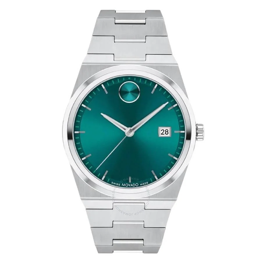 Silver-tone stainless steel case and bracelet. Fixed silver-tone stainless steel bezel. Green sunray dial with silver-tone hands and index hour markers. Signature dot at the 12 o'clock position. Minute markers around the outer rim. Dial Type: Analog. Date display at the 3 o'clock position. Quartz movement. Scratch resistant K1 crystal. Pull / push crown. Solid case back. Round case shape, case size: 40 mm. Fold over clasp with a safety release. Water resistant at 50 meters / 165 feet. Functions: date, hour, minute, second. Bold Quest Series. Dress watch style. Watch label: Swiss Made. Movado Bold Quest Quartz Green Dial Watch 3601222. GENERAL Box Type: Original Box CASE Case Material: Stainless Steel Case Shape: Round Case Back: Solid BAND Band Material: Stainless Steel Band Type: Bracelet Band Color: Silver-tone Clasp: Fold Over with Safety Release DIAL Dial Color: Green Sunray Type: Analog Crystal: Scratch Resistant K1 Hands: Silver-tone Dial Markers: Index Second Markers: Signature dot at the 12 o'clock position. Minute Markers around the outer rim Bezel: Fixed Bezel Color: Silver-tone Bezel Material: Stainless Steel Crown: Pull / Push INFORMATION Brand: Movado Series: Bold Quest Collection Name: Bold Quest Gender: Mens Model: 3601222 Watch Label: Swiss Made Movement: Quartz FEATURES Water Resistance: 50 meters / 165 feet Calendar: Date display at the 3 o'clock position Functions: Date, Hour, Minute, Second Watch Features: Stainless Steel, Analog ADDITIONAL INFO Watch Style: Dress Warranty: 2 Year Jomashop Warranty Jomashop Sku: MV3601222 Department: Watches