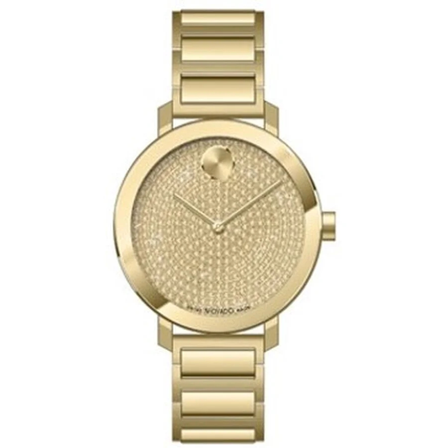 Yellow gold-tone stainless steel case and bracelet. Fixed yellow gold-tone stainless steel bezel. Gold-tone dial with yellow gold-tone hands. Dial Type: Analog. Quartz movement. Solid case back. Round case shape, case size: 34 mm. Fold over clasp with a safety release. Functions: hour, minute. Evolution Series. Luxury watch style. Watch label: Swiss Made. Movado Evolution Quartz Gold Dial Ladies Watch 3601152. GENERAL Box Type: Original Box CASE Case Diameter: 34 mm Case Material: Stainless Steel Case Shape: Round Case Back: Solid BAND Band Material: Stainless Steel Band Type: Bracelet Band Color: Yellow Gold-tone Clasp: Fold Over with Safety Release DIAL Dial Color: Gold-tone Type: Analog Hands: Yellow Gold-tone Bezel: Fixed Bezel Color: Yellow Gold-tone Bezel Material: Stainless Steel INFORMATION Brand: Movado Series: Evolution Collection Name: Evolution Gender: Womens Model: 3601152 Watch Label: Swiss Made Movement: Quartz FEATURES Functions: Hour, Minute Watch Features: Analog, Gold, Stainless Steel ADDITIONAL INFO Watch Style: Luxury Warranty: 2 Year Jomashop Warranty Jomashop Sku: MV3601152 Department: Watches