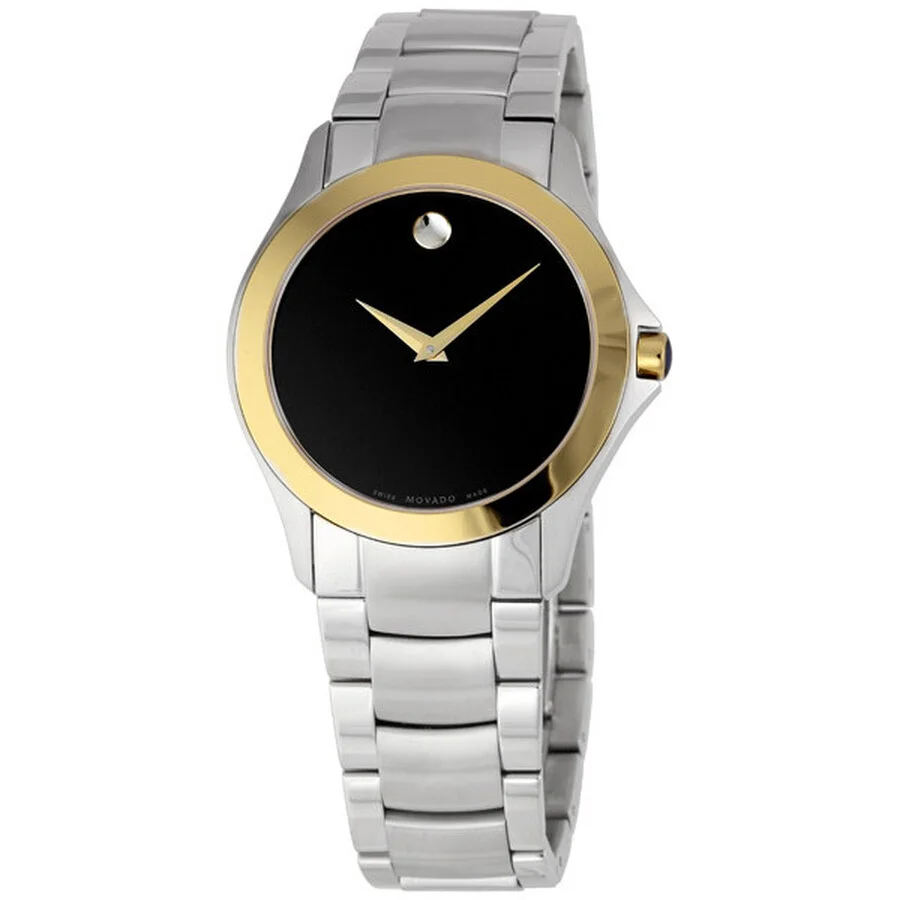Stainless steel case with a stainless steel bracelet. Fixed gold-tone stainless steel bezel. Black dial with gold-tone hands. No markers. The Movado Dot appears at the 12 o'clock position. Quartz movement. Scratch resistant sapphire crystal. Solid case back. Case diameter: 35 mm. Hidden deployment clasp. Water resistant at 30 meters / 100 feet. Functions: hour/ minute. Movado Military Two-Tone Steel Men's Watch 0605871. GENERAL Box Type: Original Box Color: Black CASE Case Material: Stainless Steel Case Shape: Round Case Back: Solid BAND Band Material: Stainless Steel Band Type: Bracelet Band Color: Silver-tone Clasp: Hidden Deployment DIAL Dial Color: Black Type: Analog Crystal: Scratch Resistant Sapphire Hands: Gold-tone Second Markers: Movado Dot appears at the 12 o'clock position Bezel: Gold-tone Stainless Steel INFORMATION Brand: Movado Series: Military Collection Name: Military Gender: Mens Model: 0605871 Watch Label: Swiss Made Movement: Quartz FEATURES Water Resistance: 30 meters / 100 feet Functions: Hour/ Minute Watch Features: Analog, Gold, Stainless Steel ADDITIONAL INFO Watch Style: Military Warranty: 2 Year Jomashop Warranty UPC Code: 0775924660097 Jomashop Sku: MV0605871 Item Variation: 605871, 0605871, Movado-605871, Movado-0605871 Department: Watches Category: Watches